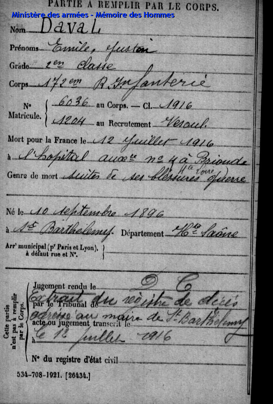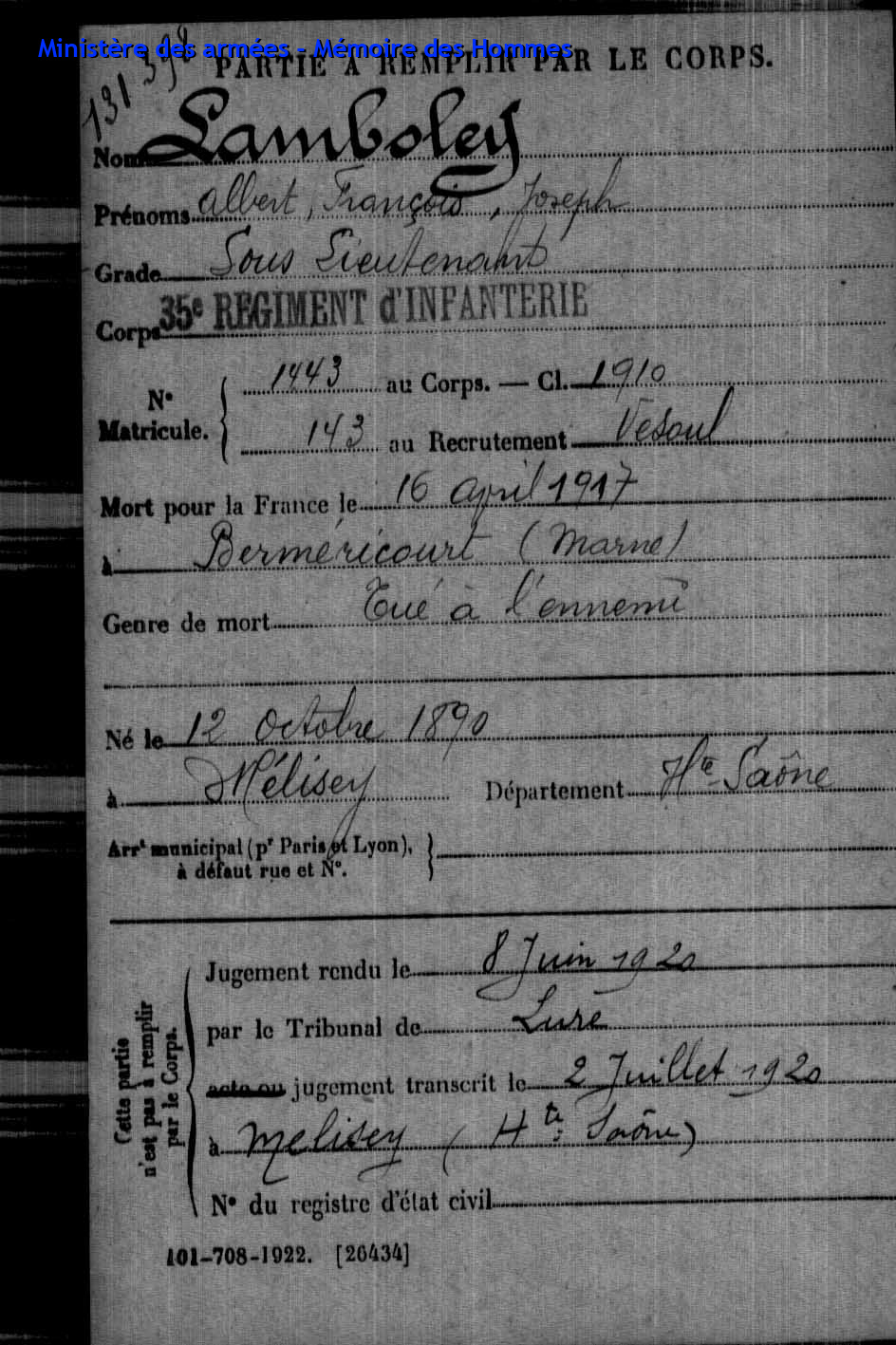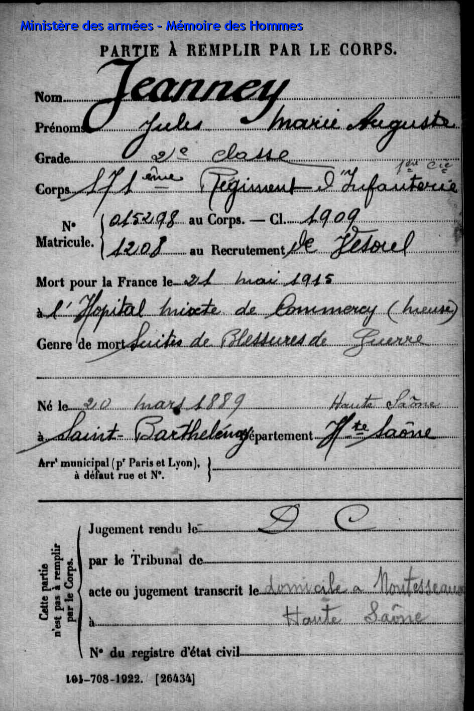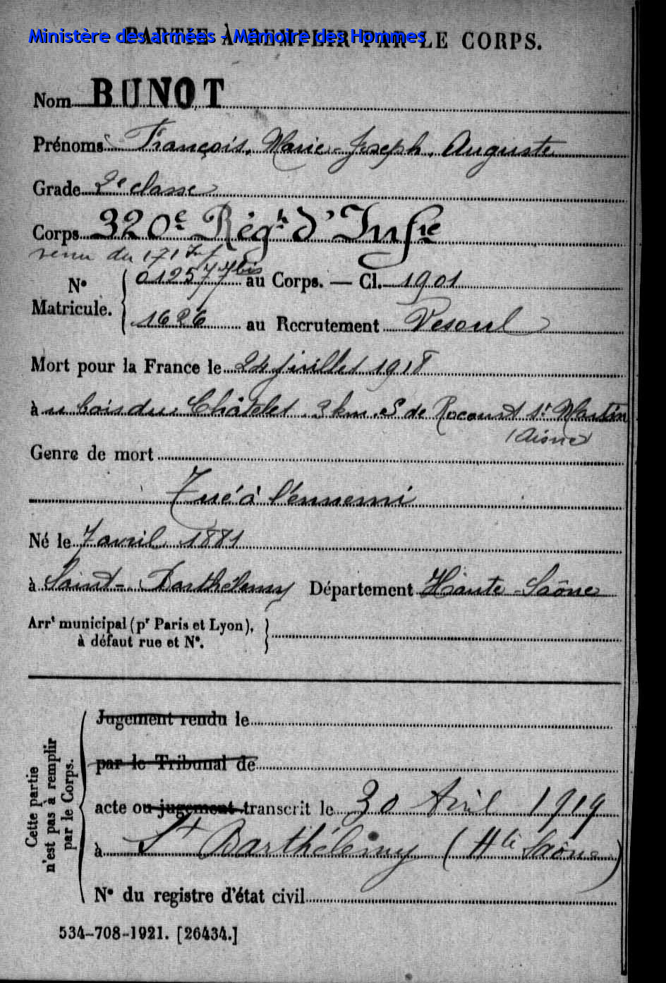 Auf dem Kriegerdenkmal der 13,46 Km2 kleinen Gemeinde mit 1091 Einwohner im Departement Haute-Saône sind 63 Namen von Kriegsopfer aufgelistet, davon sind 49 mit Fabian Coulot verwandt.