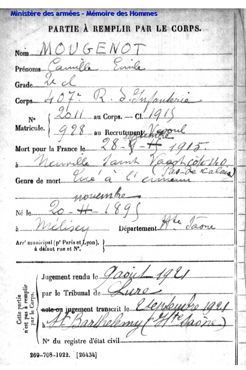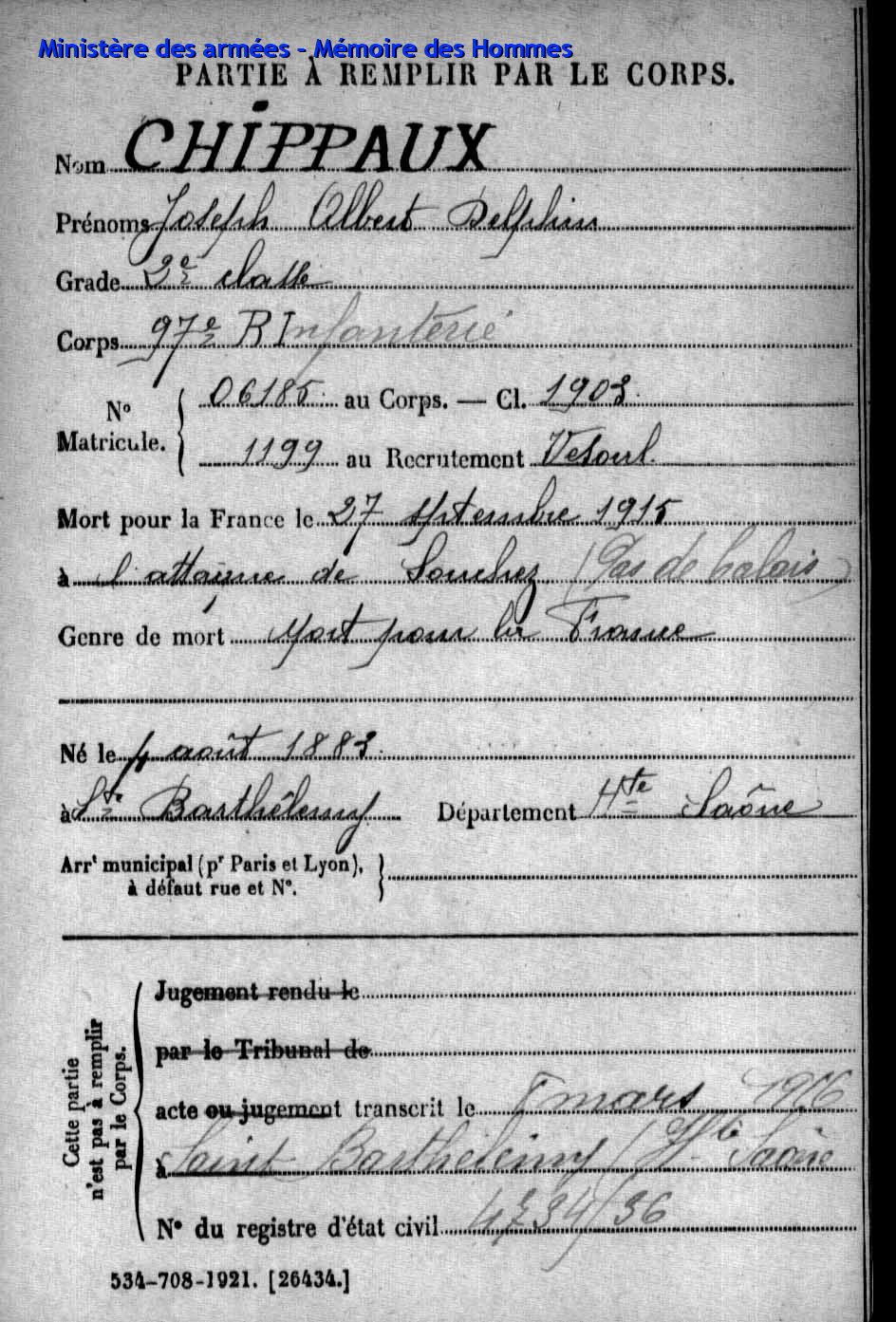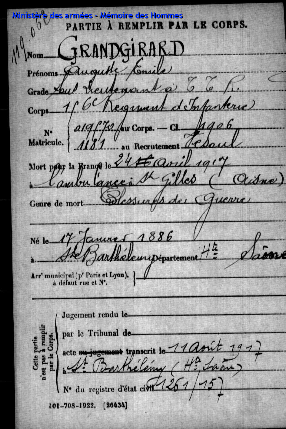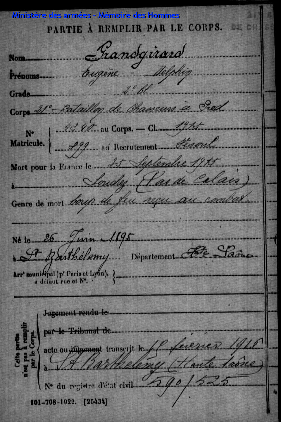 2ème classe GRANDGIRARD Eugène Delphin 26.06.1895 - 25.09.1915 21ème Bataillon de Chasseurs à Pied Gefallen in Souchez - Pas-de-Calais (F) |