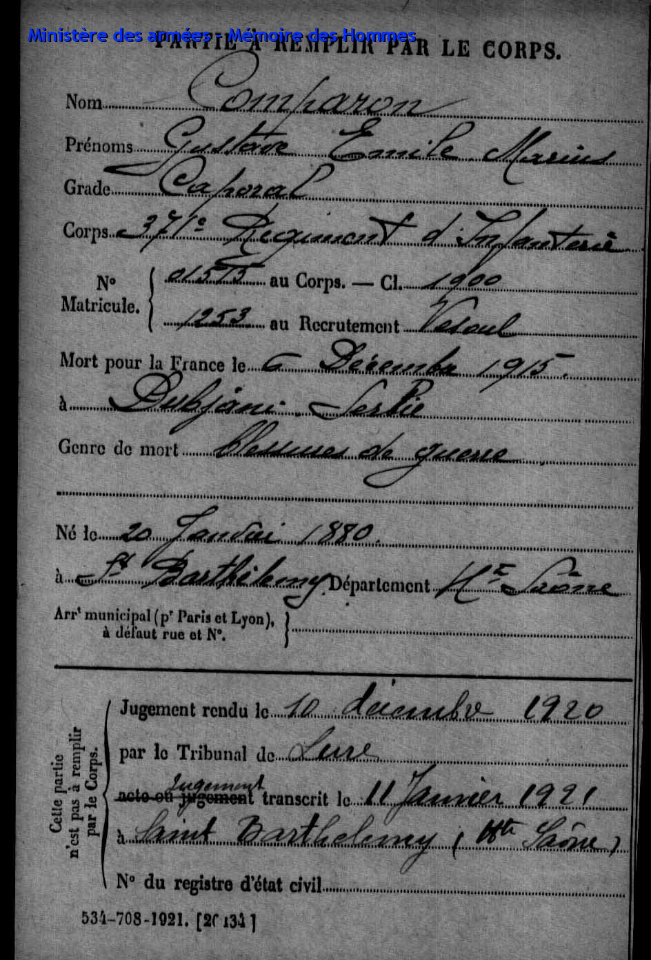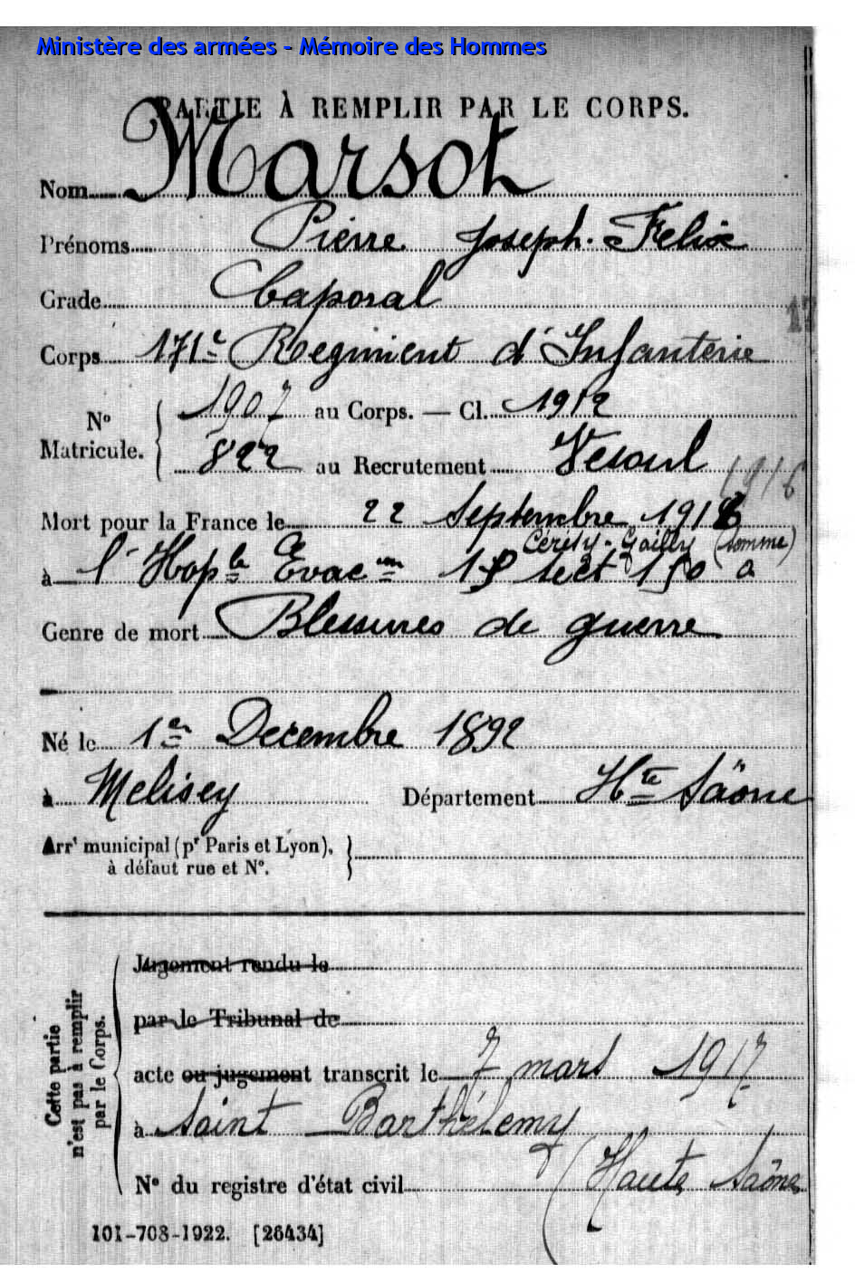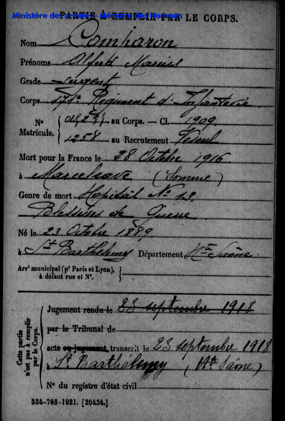 | Sergent COMPARON Alfred Marius 23.10.1889 - 28.10.1916 171ème Régiment d'Infanterie Verstarb an seinen Wunden im Hôpital No. 13 in Marcelcave - Somme (F) |