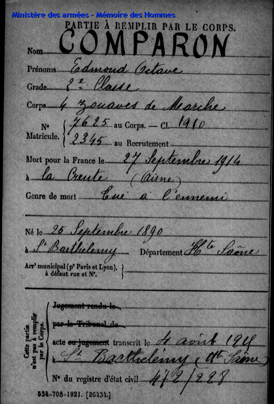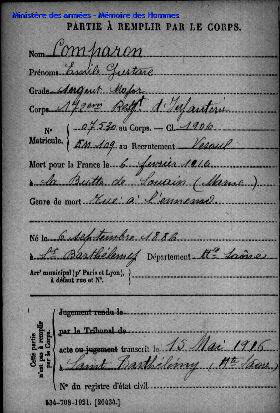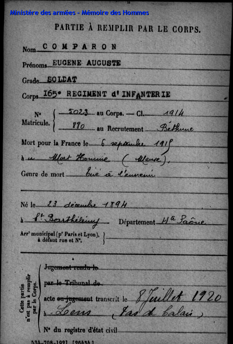 | Soldat COMPARON Eugène Auguste 23.12.1894 - 06.09.1915 165ème Régiment d'Infanterie Gefallen in Chattancourt - Meuse (F) |