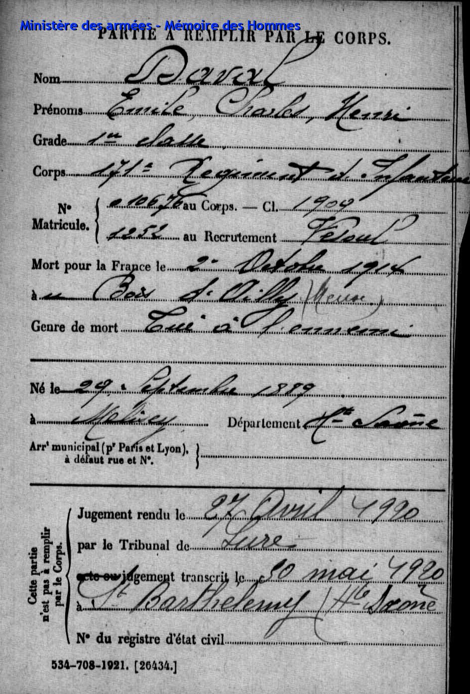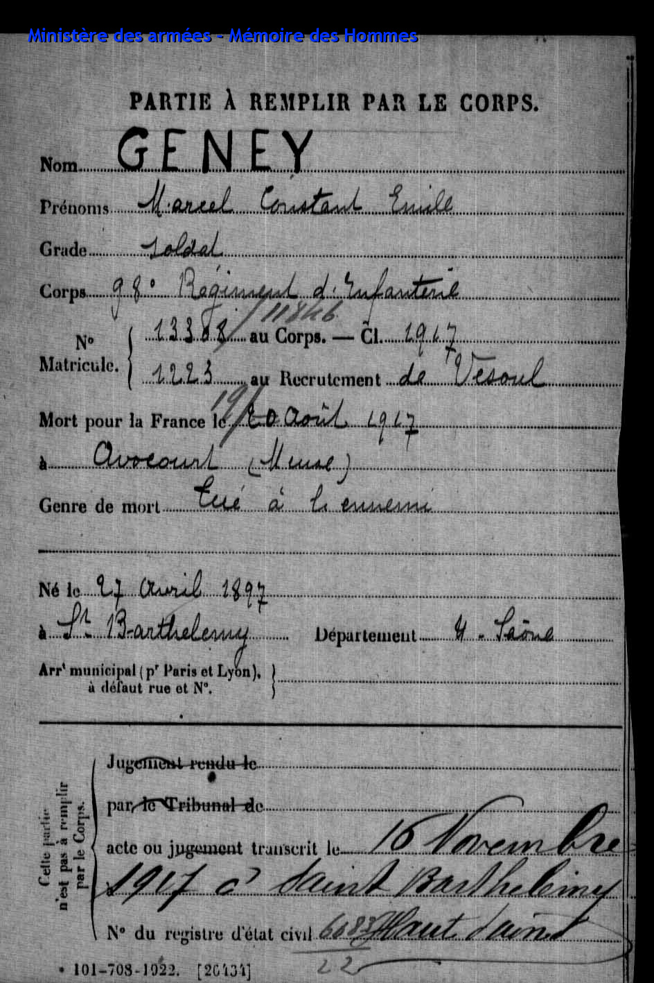 | Soldat GENEY Marcel Constant Emile 27.04.1897 - 19.08.1917 98ème Régiment d'Infanterie Gefallen in Avocourt - Meuse (F) |