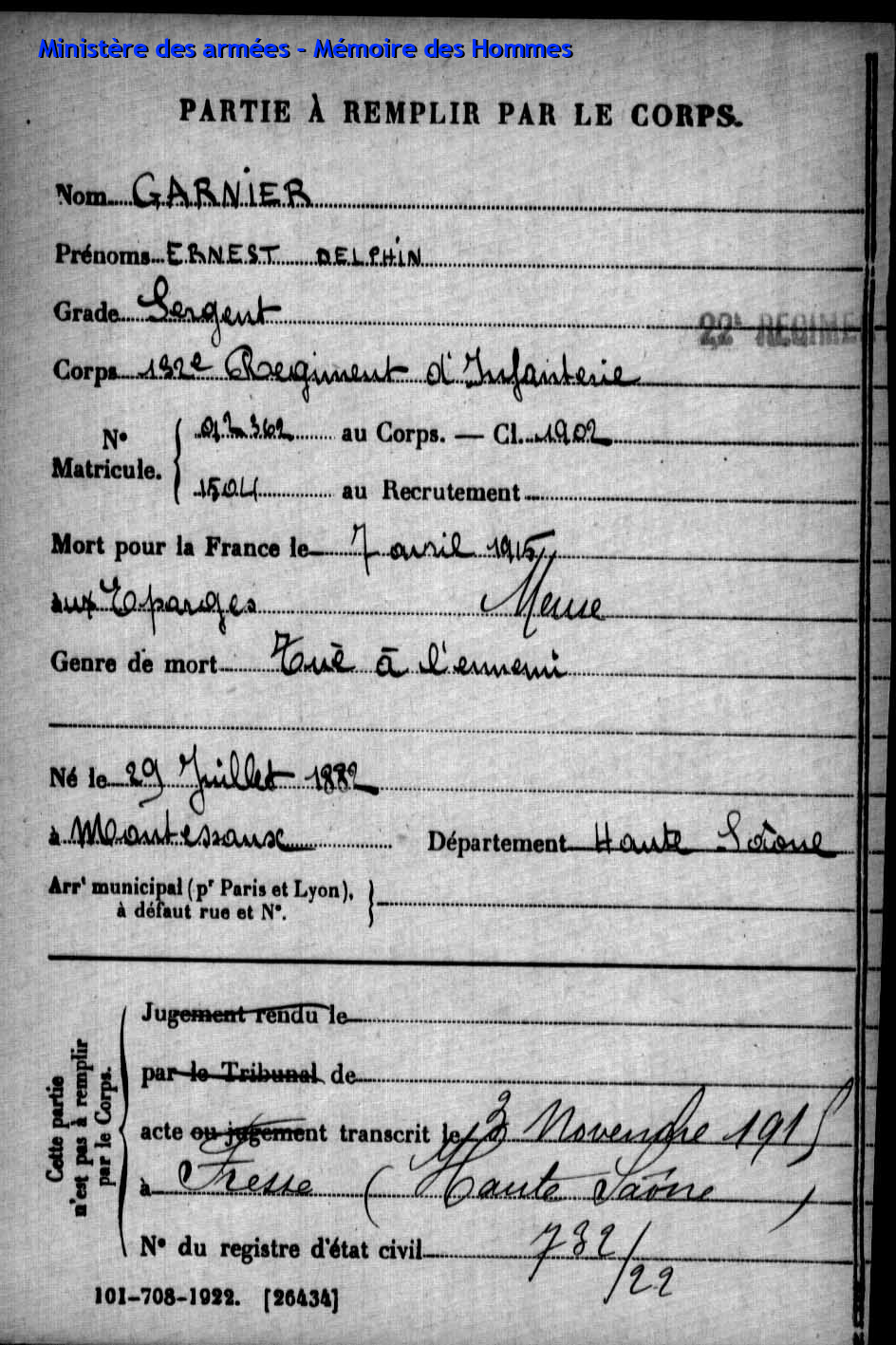 | Sergent GARNIER Ernest Delphin 29.07.1882 - 07.04.1915 132ème Régiment d'Infanterie Gefallen in Les Eparges - Meuse (F) |