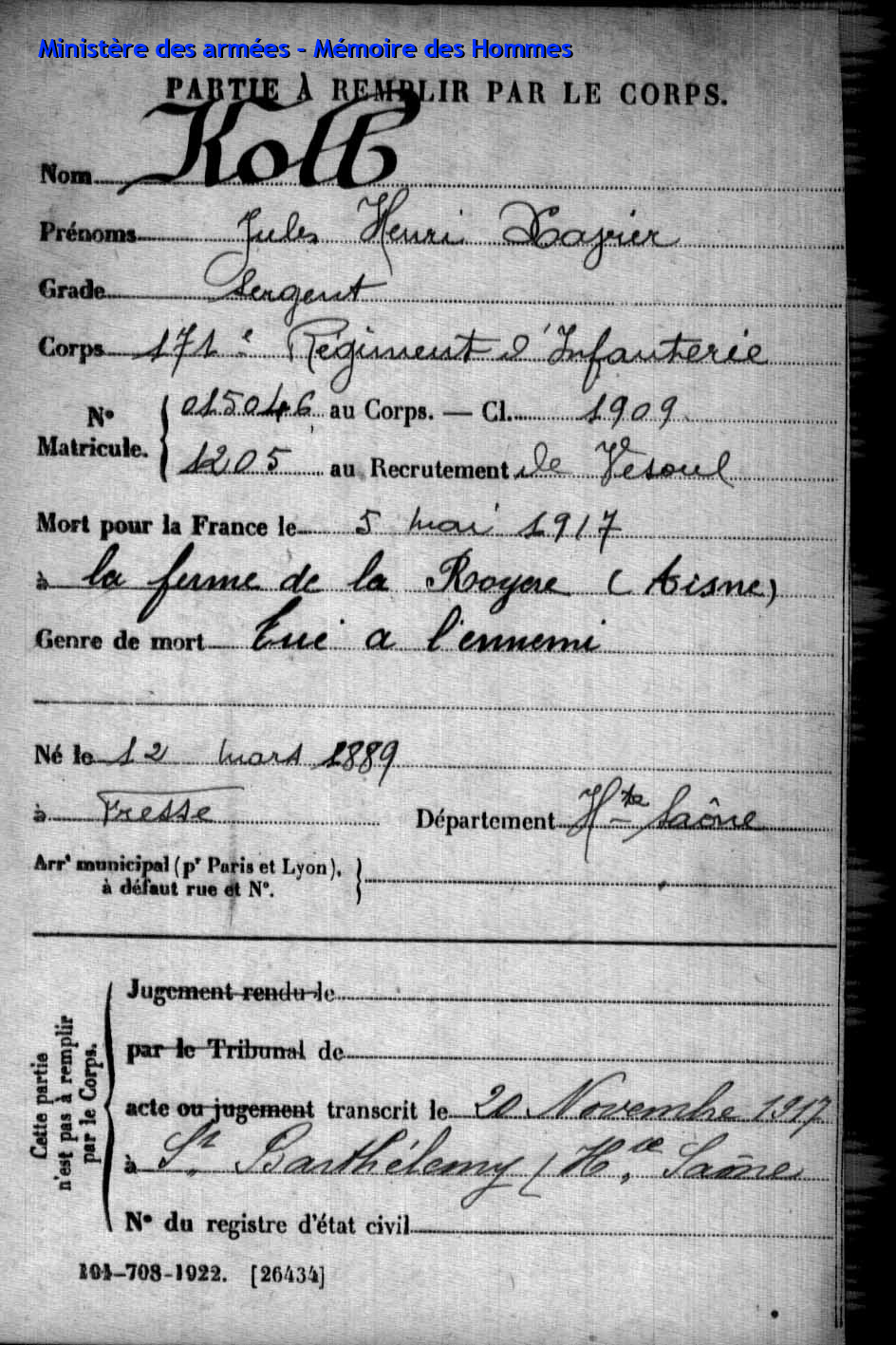 | Sergent KOLB Jules Henri Xavier 12.03.1889 - 05.05.1917 171ème Régiment d'Infanterie Gefallen in Filain - Aisne (F) |