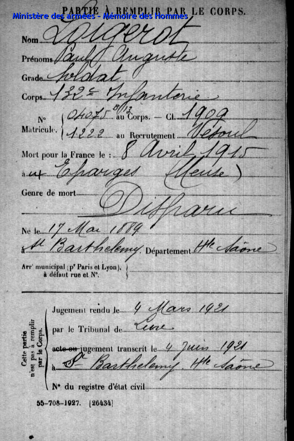 | Soldat LOIGEROT Paul Auguste 17.05.1889 - 08.04.1915 132ème Régiment d'Infanterie Gilt als vermist in Les Eparges - Meuse (F) |