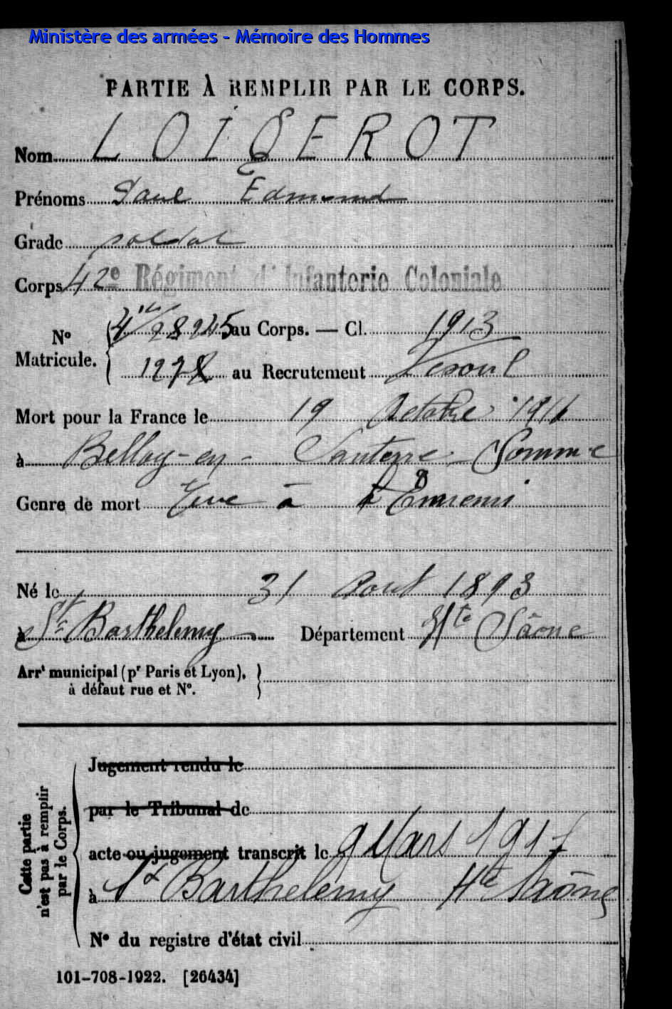 | Soldat LOIGEROT Paul Edmond 31.08.1893 - 19.10.1916 42ème Régiment d'Infanterie Gefallen in Belloy - Somme (F) |