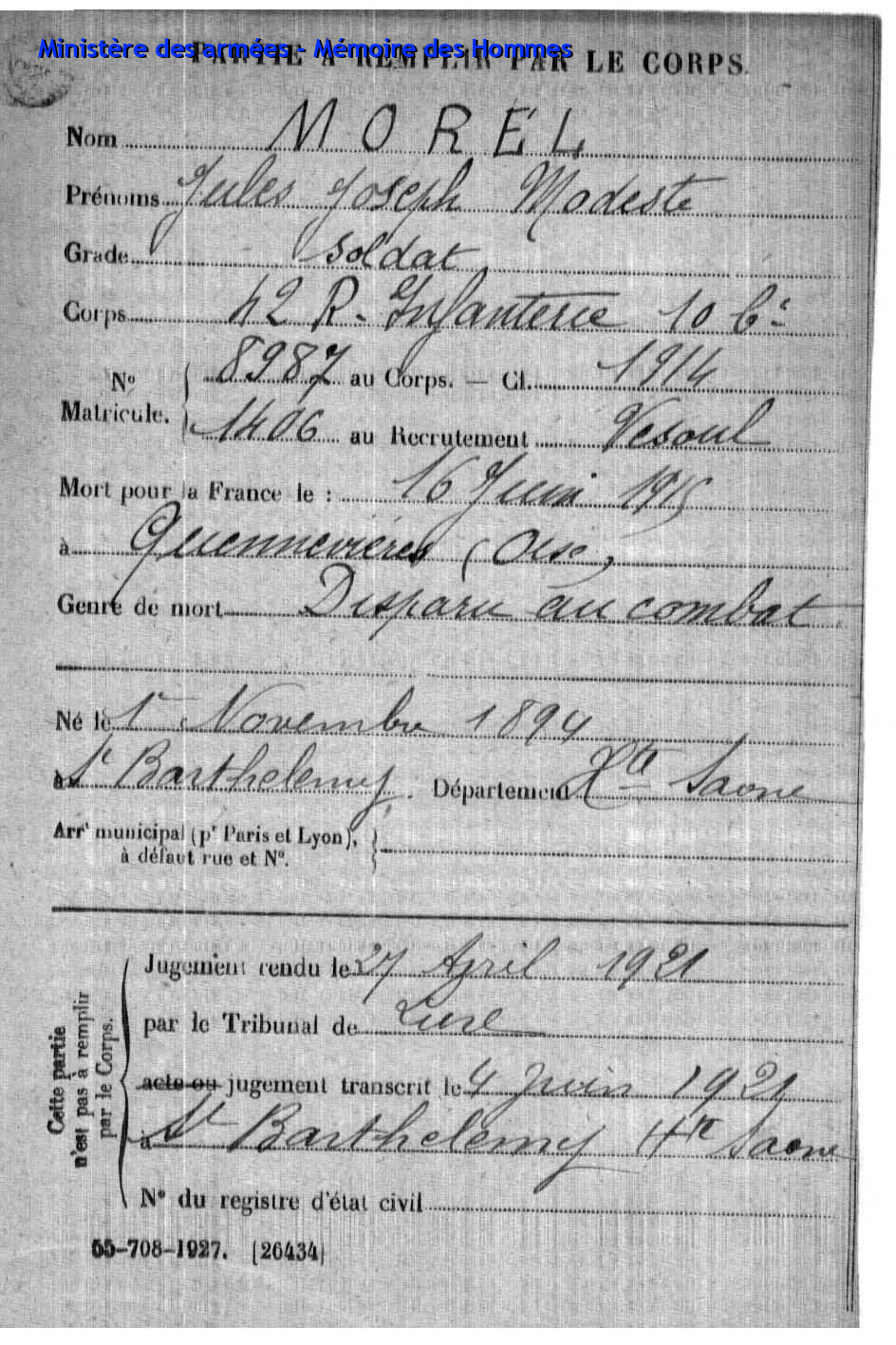 | Soldat MOREL Jules Joseph Modeste 01.11.1894 - 16.06.1915 42ème Régiment d'Infanterie 10ème Compagnie Gilt als vermisst in Moulin-sous-Touvent - Oise (F) |