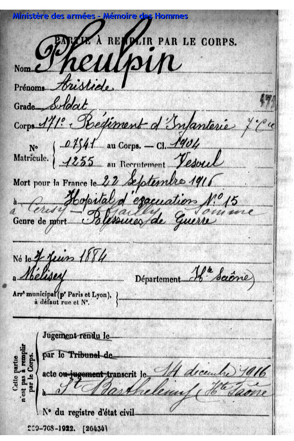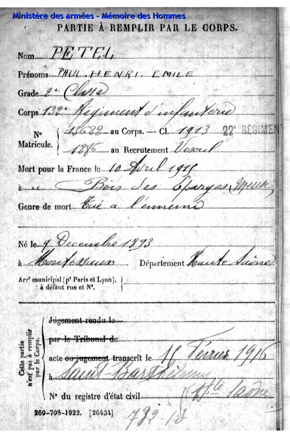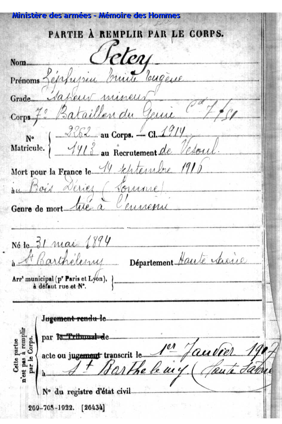 Sapeur-mineur PETEY Zéphirin Emile Eugène 21.05.1894 - 14.09.1916 7ème Bataillon du Génie Compagnie 7/51 Gefallen in Bois de Riez - Somme (F) |