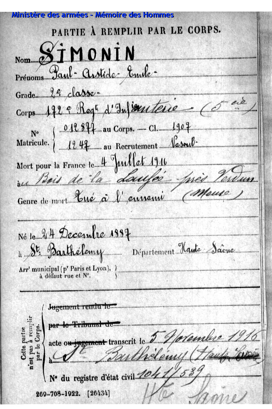 2ème classe SIMONIN Paul Aristide Emile 24.12.1887 - 04.07.1916 172ème Régiment d'Infanterie Gefallen in Damloup (Verdun) - Meuse (F) |