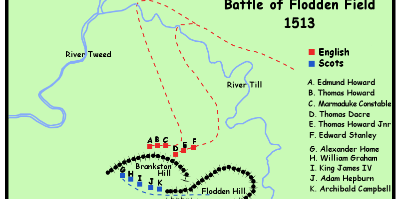 Eine schottische Invasionsarme unter der Führung von König Jakob der IV. Stewart von Schottland marschierte mit 60'000 Mann in England ein. Als er schliesslich das Schlachtfeld erreichte, betrug die Stärke seiner Truppen nur noch etwa 30.000 Mann, da viele Soldaten desertierten oder bei kleineren Scharmützel getötet wurden. Die Schlacht fand nahe dem Dorf Branxton in der Grafschaft Northumberland, etwa 5 Km von der schottischen Grenze entfernt, statt.