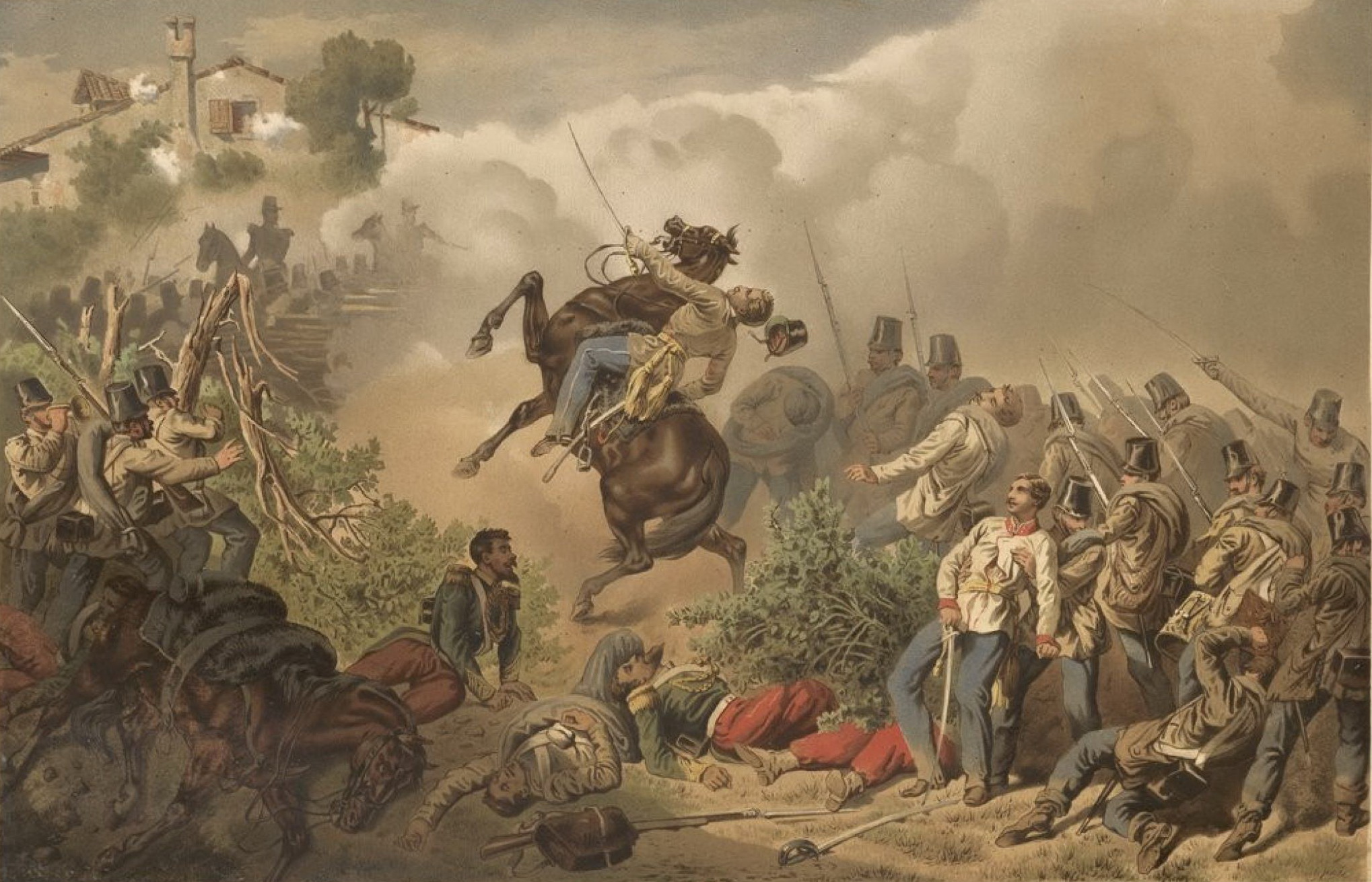 Die Schlacht von Solferino war die Entscheidungsschlacht im Sardinischen Krieg zwischen dem Kaisertum Österreich und dem Königreich Sardinien mit dessen Verbündeten Frankreich unter Napoléon III. Durch die Niederlage der Österreicher wurde der Krieg von Sardinien gewonnen und eer Weg zur Einigung Italiens eröffnet. Die Grausamkeit der Schlacht und die Hilflosigkeit der verwundeten Soldaten ( rund 29'000 Tote und 10'000 Vermisste und Gefangene auf beiden Seiten) veranlasste dem Schweizer Philanthrop Henry Dunant (1828-1910) zur Gründung des Roten Kreuzes und führte zur Vereinbarung der Genfer Konvention von 1863.