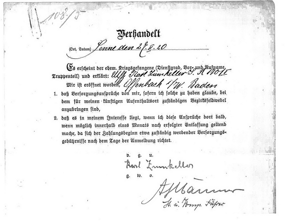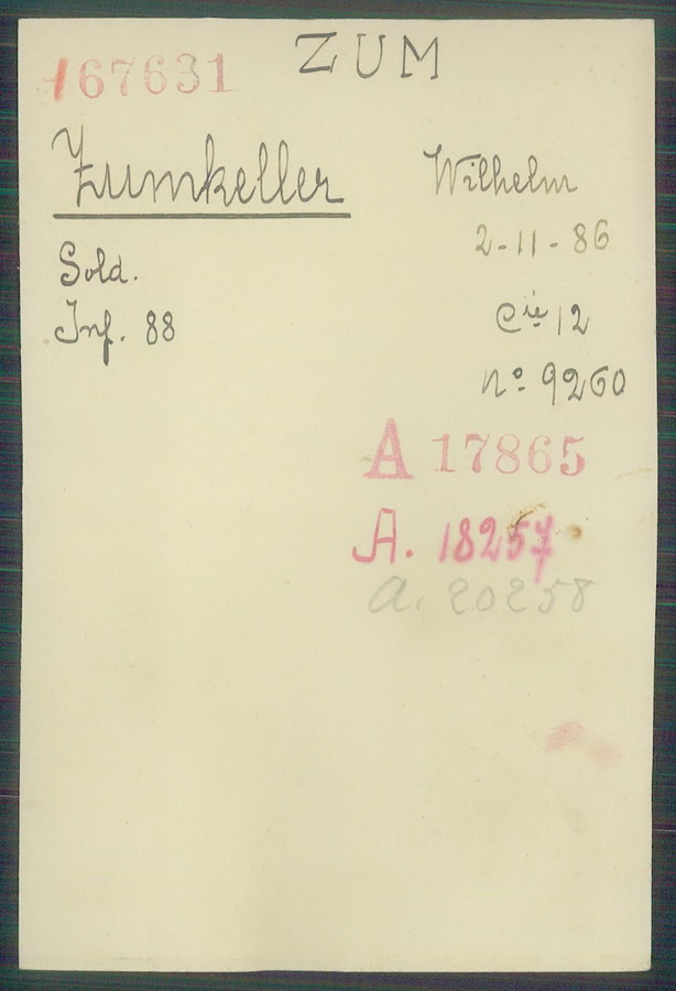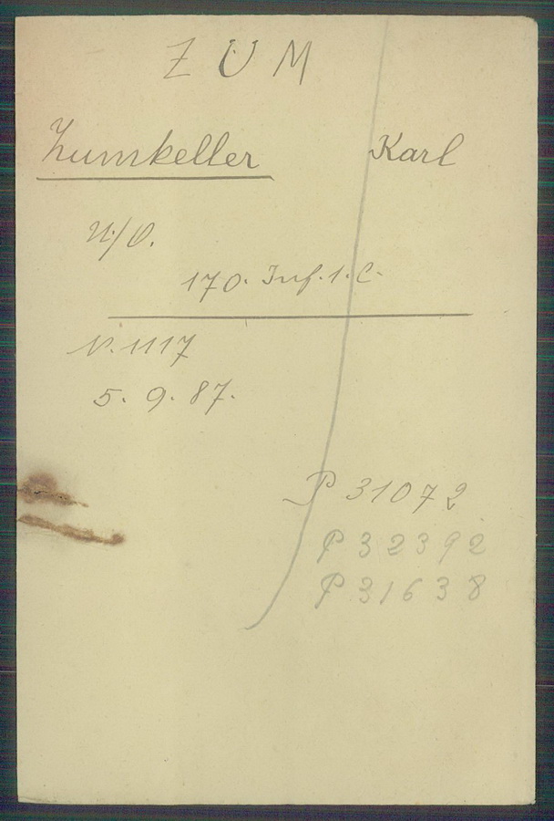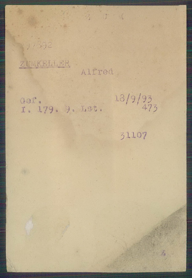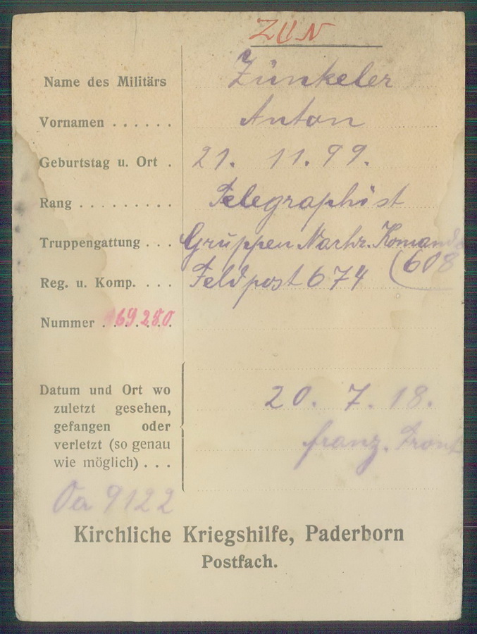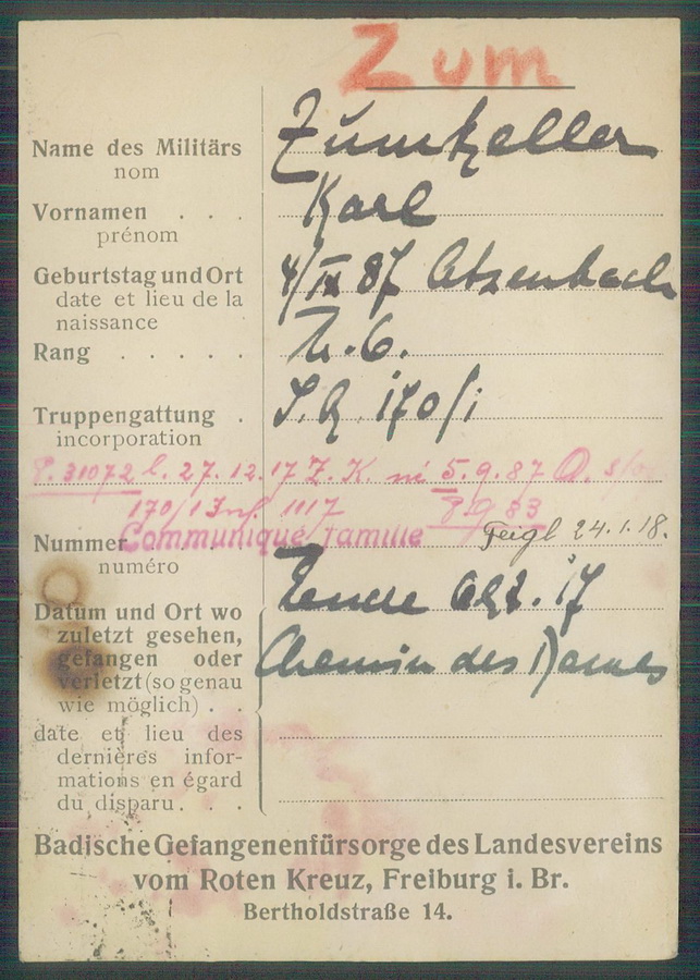 | Gefreiter Alfred ZUMKELLER geboren: 18.09.1893 ev. Zwickau Infanterie Regiment 179, 9.Kompagnie Lst Gefangennahme in Brancourt, leichte Verletzung linke Schulter