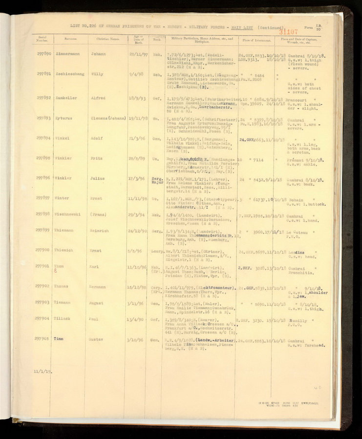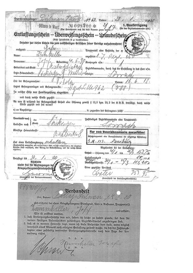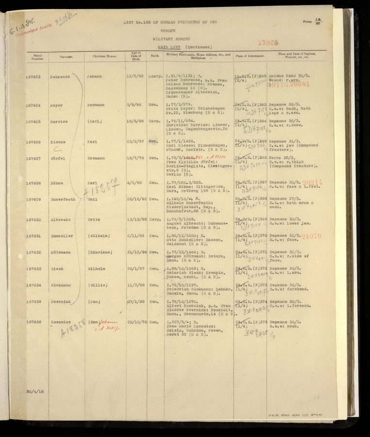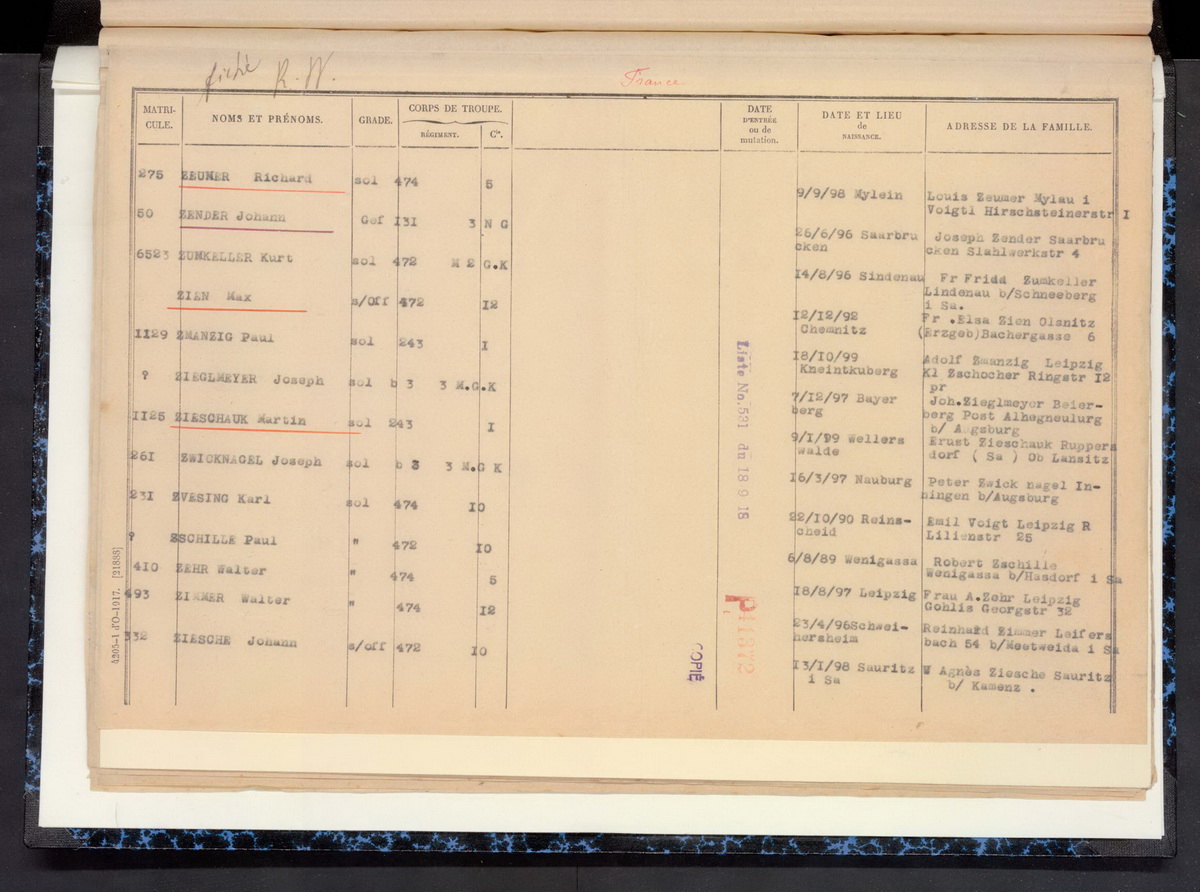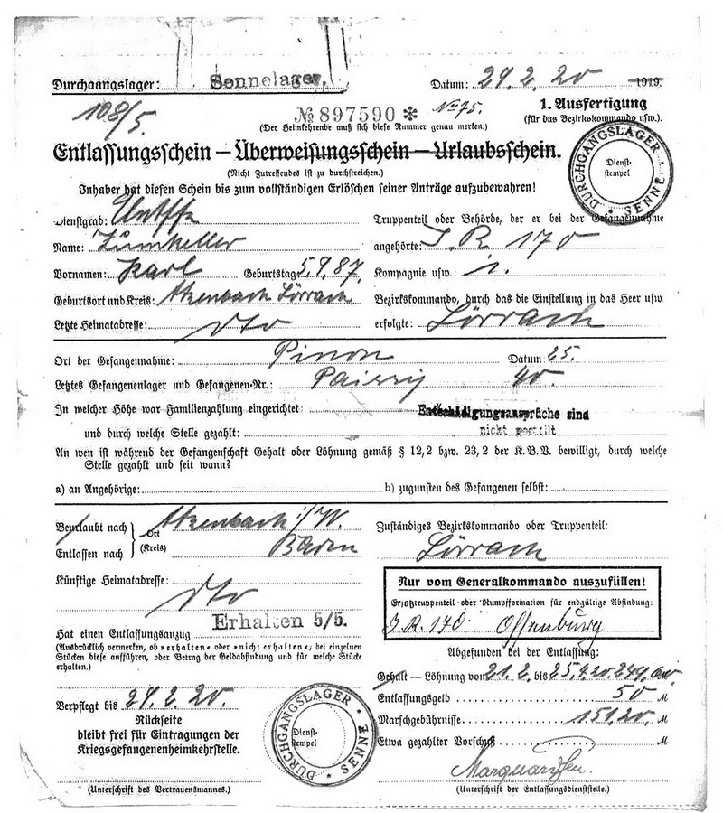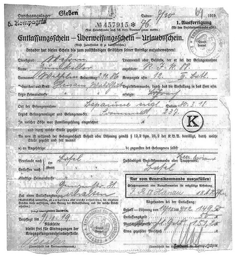 | Gefreiter Alfred ZUMKELLER geboren: 18.09.1893 ev. Zwickau Infanterie Regiment 179, 9.Kompagnie Lst Gefangennahme in Brancourt, leichte Verletzung linke Schulter