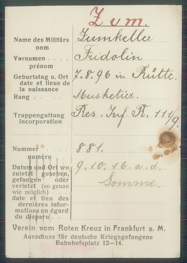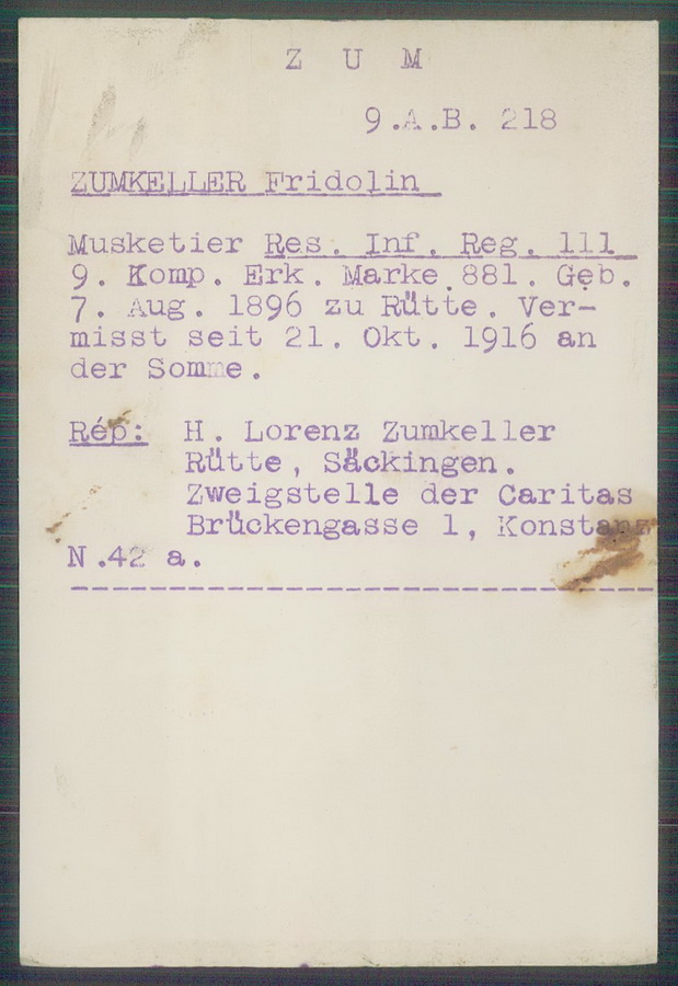 | Musketier Fridolin ZUMKELLER geboren: 07.08.1896 in Rütte, Konstanz Reserve Infanterie Regiment 111, 9. Kompagnie Vermisst seit 21.10.1916 beim Gefecht an der Somme |