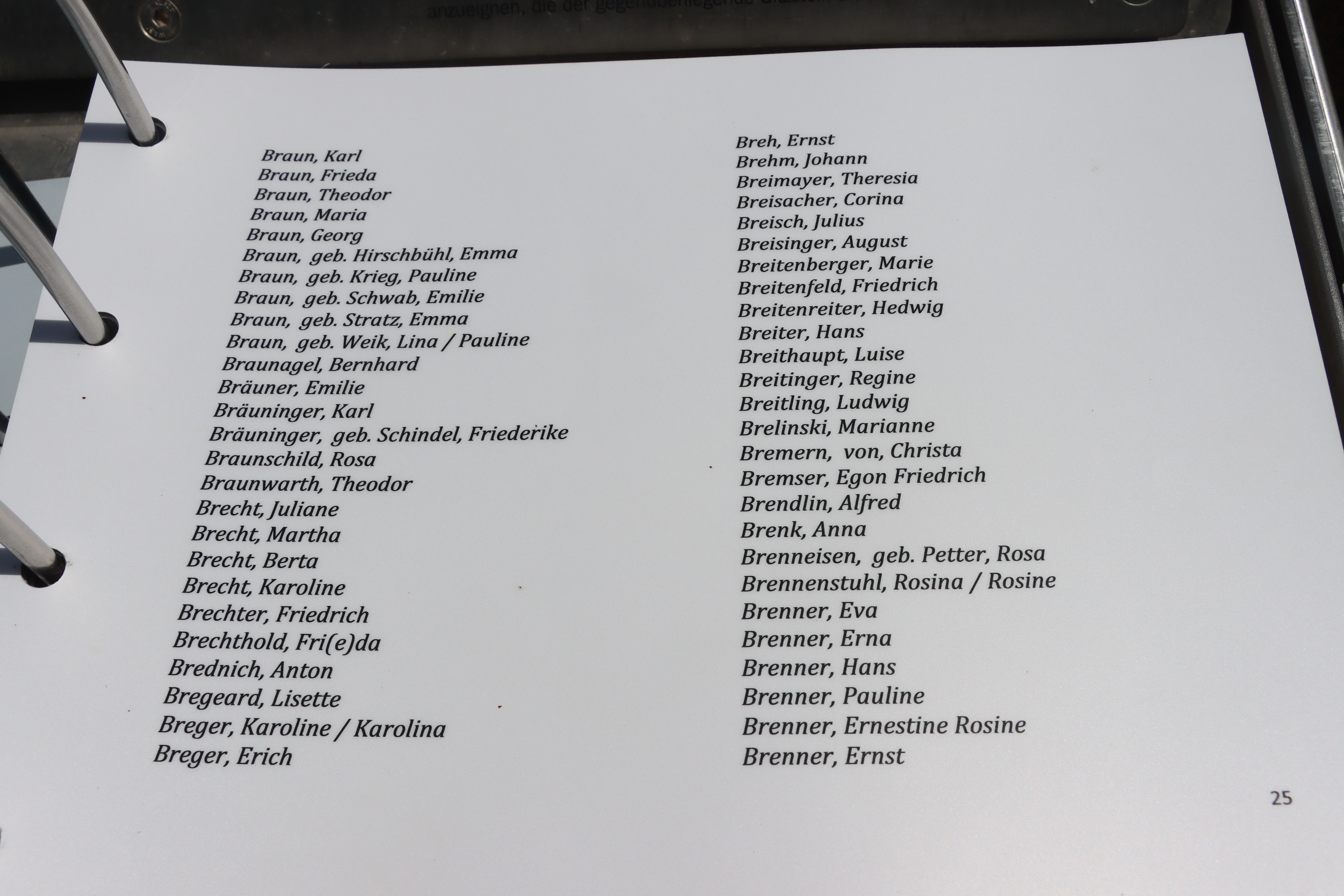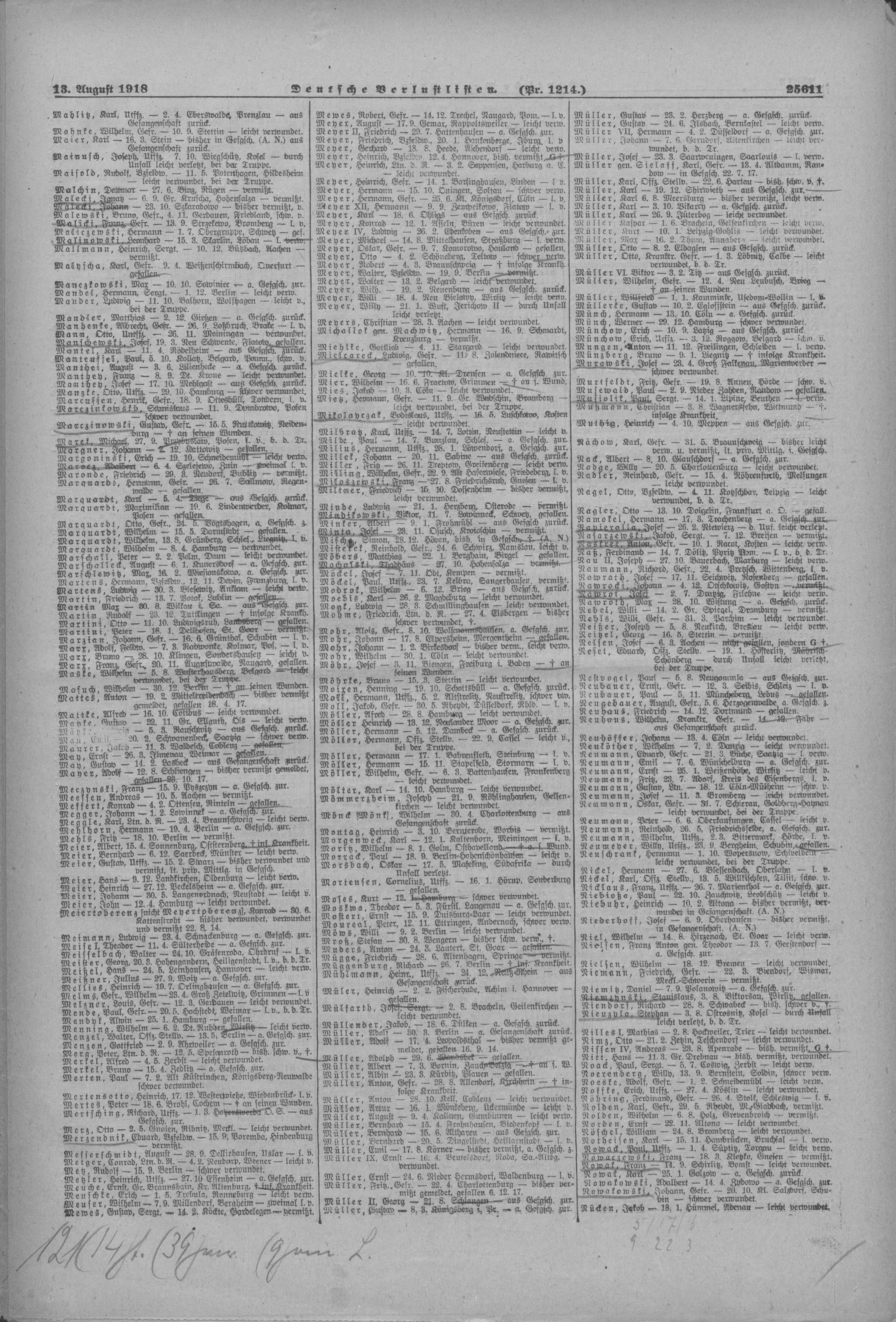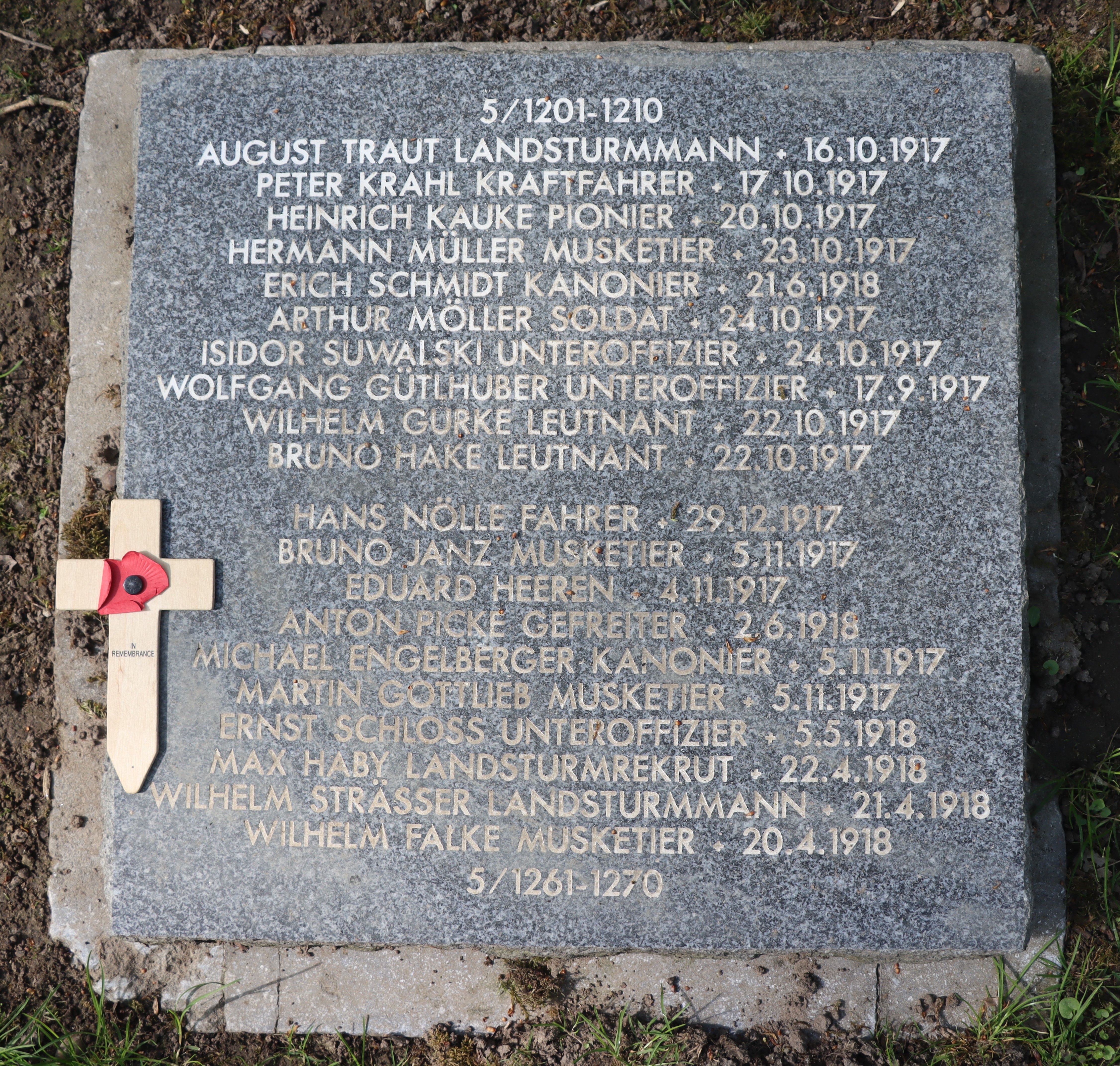 | Pionier BRENDLIN Hermann 26.12.1891 - 06.12.1915 Pionier-Ersatz-Bataillon No.14 Verstarb durch Schrapnellschuss in den Rücken im Reserve-Feldlazarett No.109, Verbandsplatz II in Lostajanze (LT) Militärfriedhof in Vilnius (LT) |