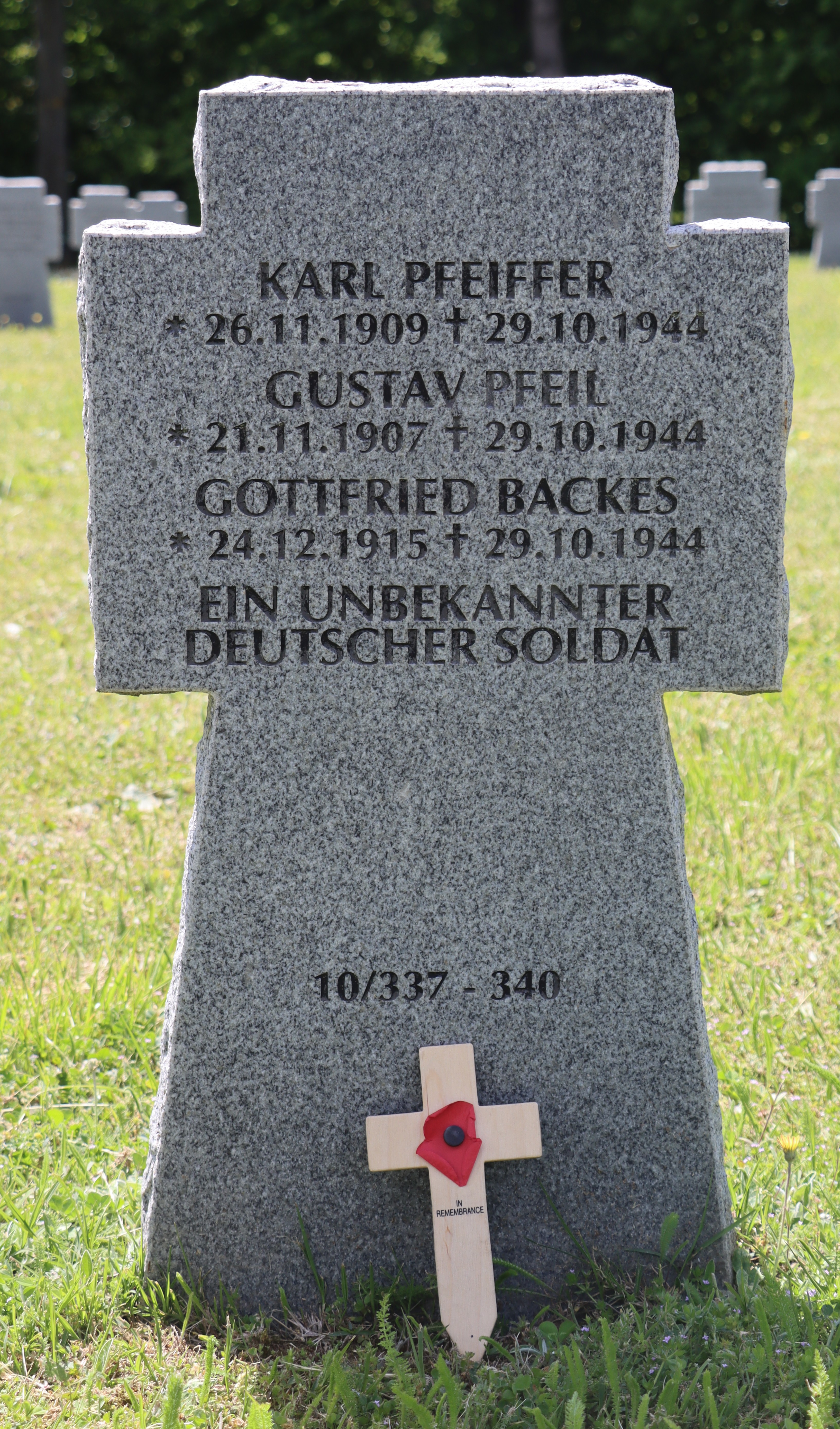 Obergefreiter PFEIFFER Martin 30.08.1912 - 01.04.1944 Grenadier-Regiment No. 435 12. Kompagnie Gefallen in Tscherescha (RUS) Kriegsgräberstätte in Sebesh (RUS) Block 4, Reihe 3, Grab 120 |