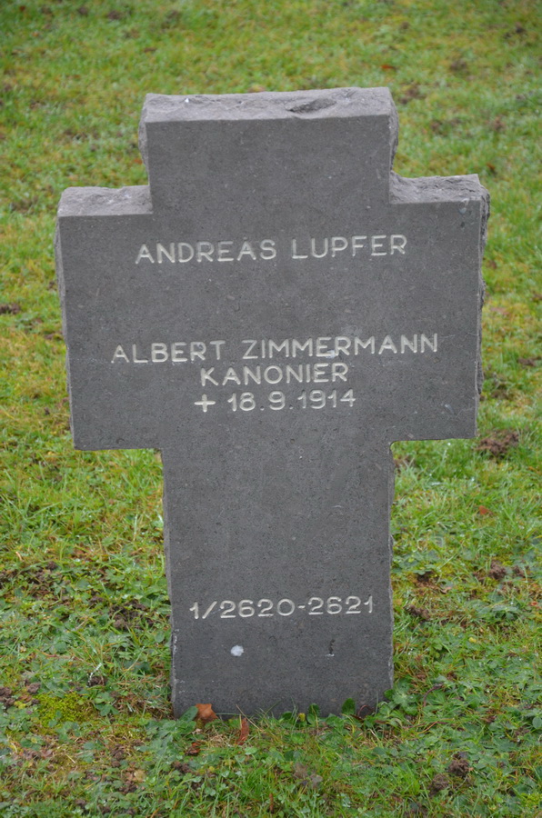 Kanonier ZIMMERMANN Albert 10.03.1890 - 18.09.1914 24 Jahre alt aus Binzen Feldartillerie Regiment No. 66, II.Batterie Gefallen in Frankreich Sein Grab befindet sich bei der Kriegsgräberstätte Cerny-en-Laonnois Block 1, Grab 2621 *Onkel von Max + Georg Zimmermann *Urgrossneffe des 2 x Ur-Grossonkels durch Heirat der Ehefrau des Neffen dritten Grades der Ehefrau des Cousin der Ehefrau des Grossneffen des Schwagers der Ehefrau des Cousin des Onkels durch Heirat der Ehefrau des Grossonkel zweiten Grades von Fabian Coulot |