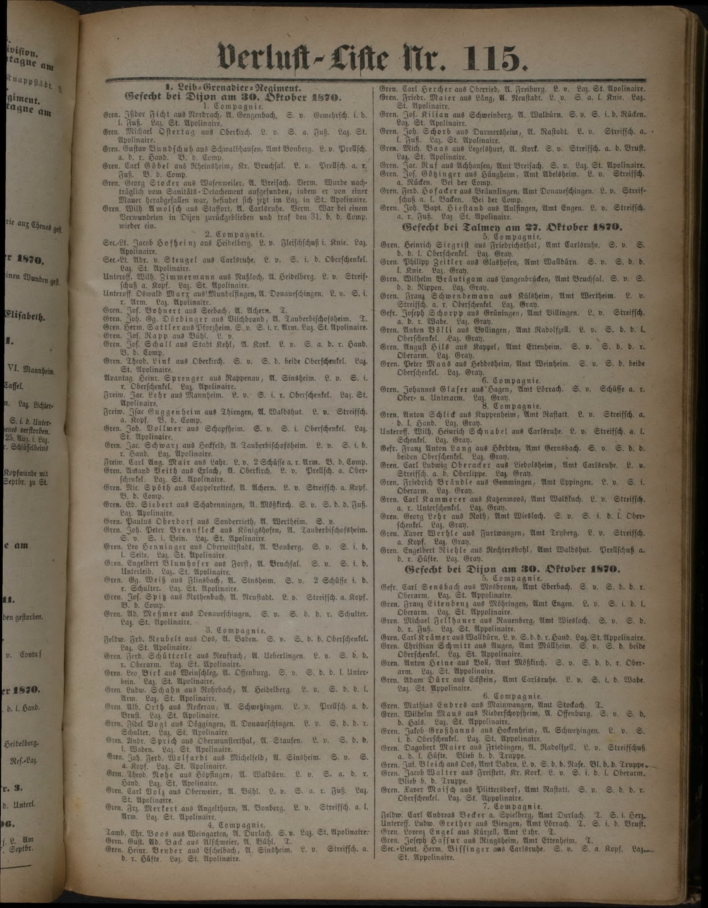 21.08.1844 - 30.12.1870 26 Jahre alt aus Binzen Grossherzoglich Badisches 5. Infanterie Regiment Füsilier Bataillon, 9. Kompagnie Schuss in die Lunge bei einem Patrouillengefecht am 30.12.1870 in Cresancey Im Lazarett verstorben *Grossonkel 2. Grades der Ehefrau des Neffen 3. Grades der Ehefrau des Cousin der Ehefrau des Grossneffen des Schwagers der Schwägerin der Ehefrau des Cousin des Onkel durch Heirat der Ehefrau des Grossonkel 2. Grades von Fabian Coulot |