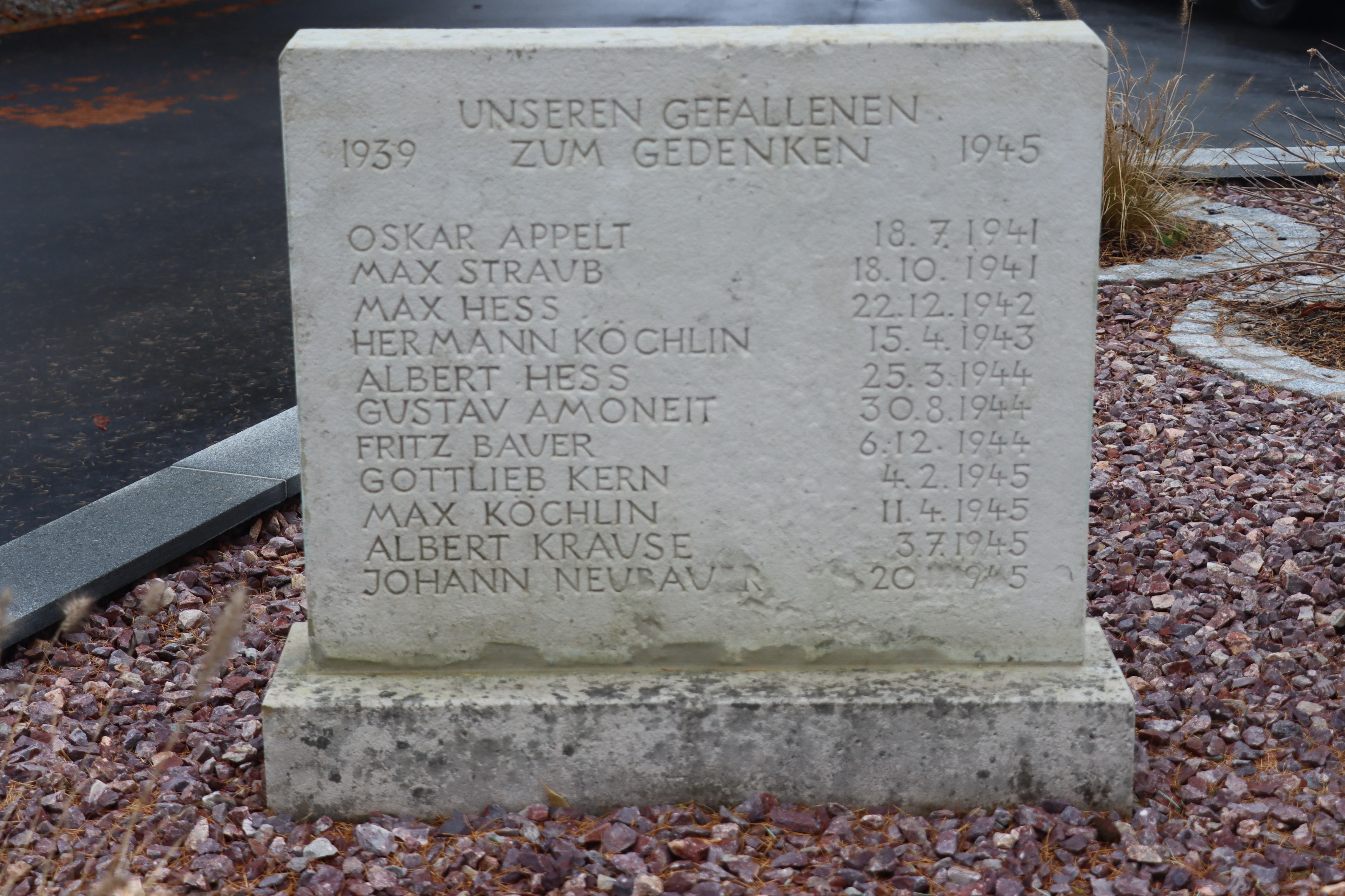 | Herr KERN Gottlieb 31.12.1874 - 04.02.1945 ziviles Kriegsopfer Beim feindlichen Beschuss des Dorfes durch Granaten schwer verwundet, erlag seinen Wunden im Elisabethen Krankenhaus |