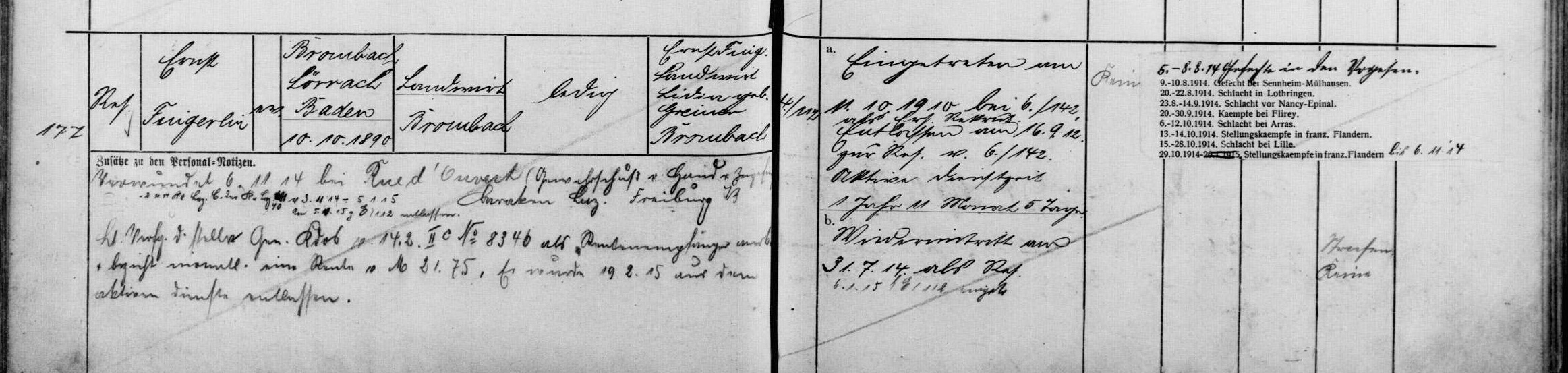 Reservist FINGERLIN Ernst 10.10.1890 - 10.10.1917 27 Jahre alt aus Brombach 4. Badische Infanterie-Regiment Prinz Wilhelm No.112 4. Kompagnie *Neffe 4.Grades des Grossonkel durch Heirat der Ehefrau des Grossneffen des 2xUr-Grossonkel durch Heirat von Fabian Coulot |