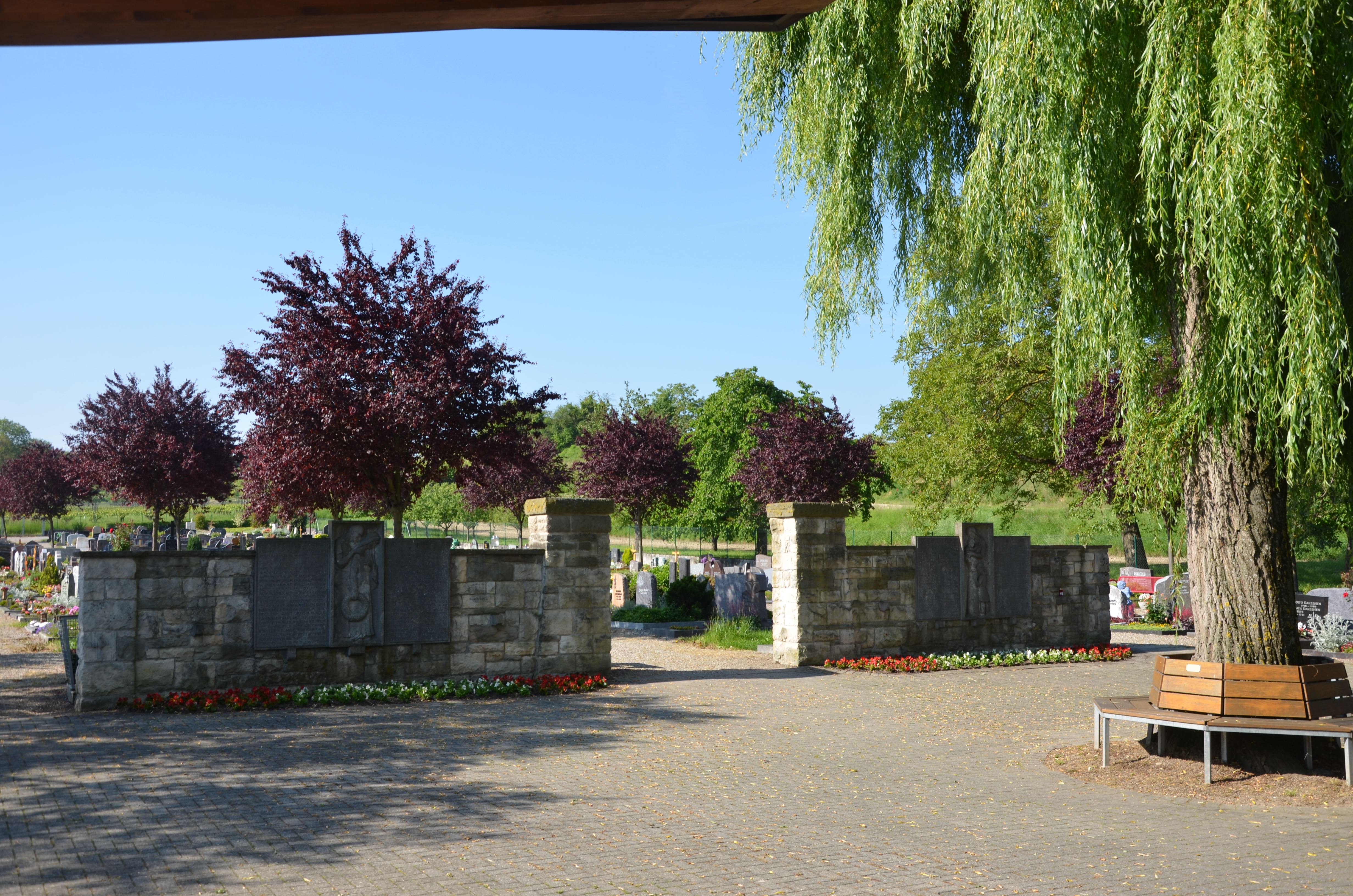 Auf dem Friedhof in sind zwei Steinmauern mit vier Gedenkplatten der Gefallenen der beiden Weltkrieg (1914-1918) + (1939-1945)
