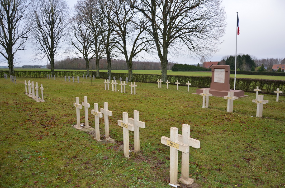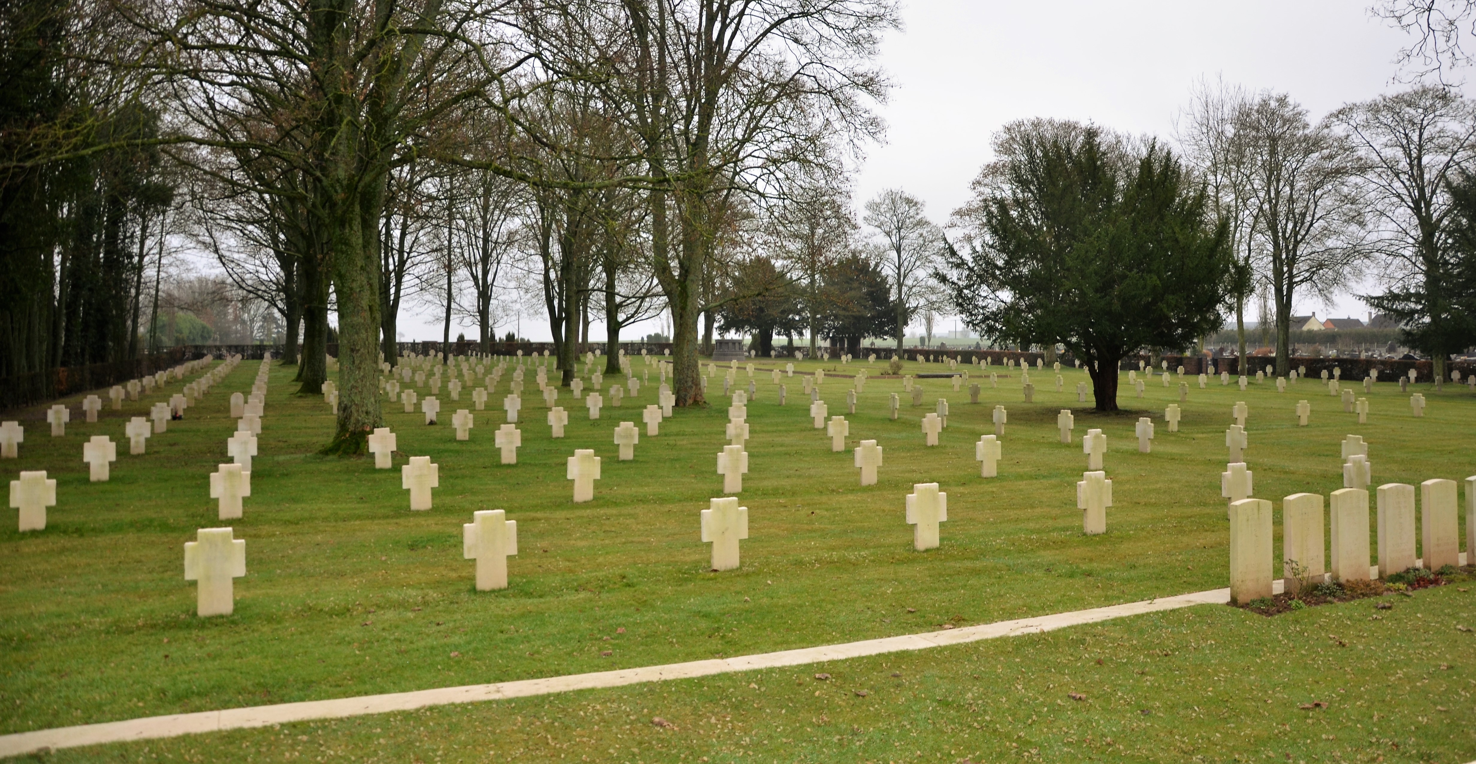 | Auf dem zivilen Friedhof der Stadt Caudry befindet sich ein "Internationaler Abschnitt" der Gräber. Im Zentrum der französische Soldatenfriedhof mit Denkmal, daneben ein britischer Soldatenfriedhof und dahinter der deutsche Soldatenfriedhof. |