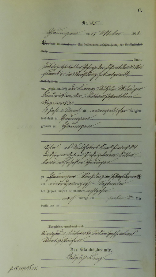 Kanonier OTT Wilhelm Friedrich 28.06.1899 - 21.09.1918 19 Jahre alt aus Hauingen Ersatz Bataillon Hohenzollerisches Fuss Artillerie Regiment No. 24 2 Batterie Ersatz Bataillon Hohenzollerisches Fuss Artillerie Regiment 24, II.Batterie Verstorben im Festungslazarett 10 in Strasbourg *Wilhelm Friedrich Ott ist der Bruder der Grossmutter mütterlicherseits von Fabian Coulot |