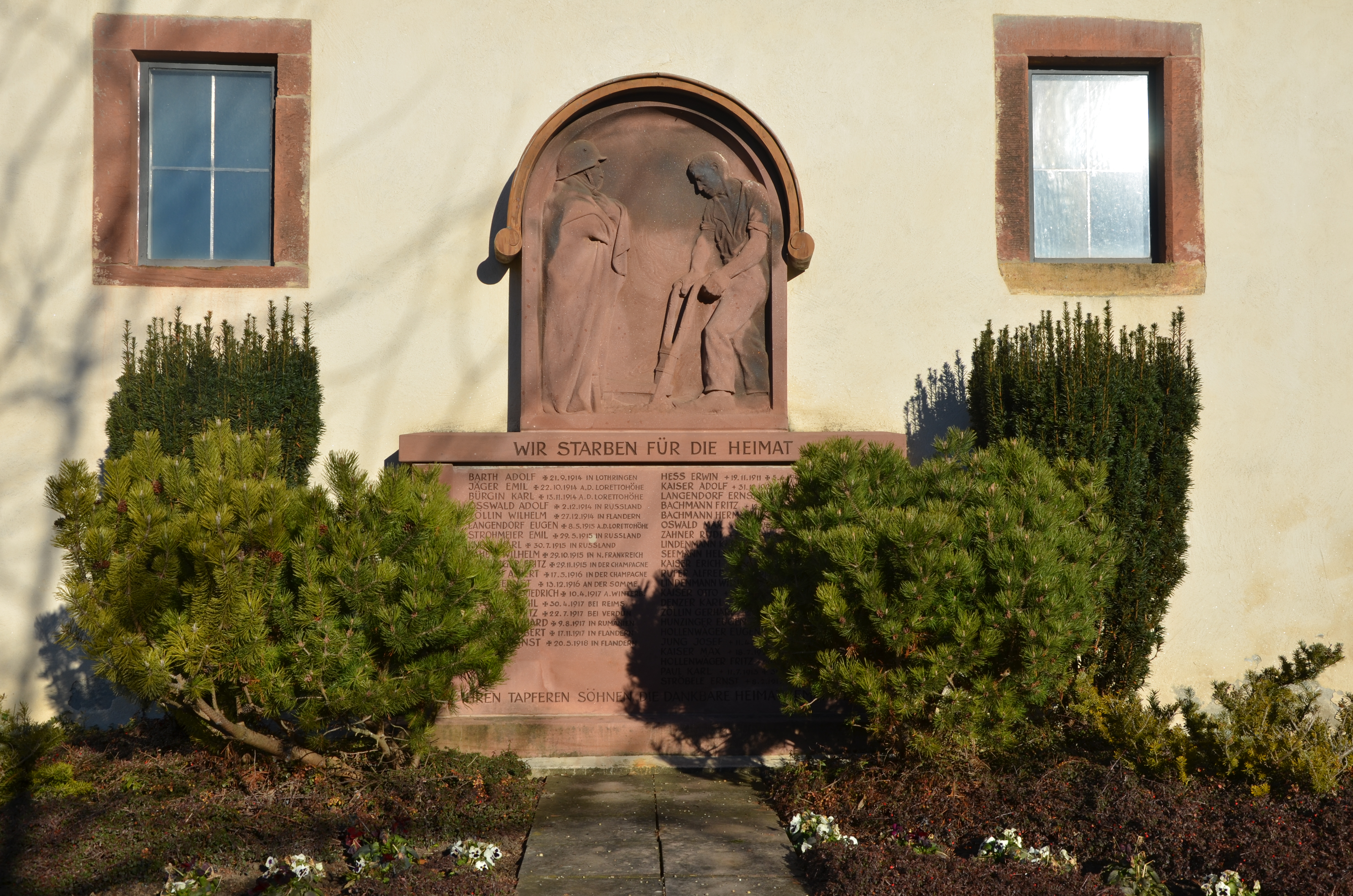 | Von den 18 Namen der Gefallenen aus dem 1. Weltkrieg (1914-1918) auf dem Denkmal an der Kirchenwand in Niedereggenen sind 11 Soldaten mit Fabian Coulot verwandt | Von den 22 Namen der Gefallenen aus dem 2. Weltkrieg (1939-1945) auf dem Denkmal an der Kirchenwand in Niedereggenen sind 18 Soldaten mit Fabian Coulot verwandt |