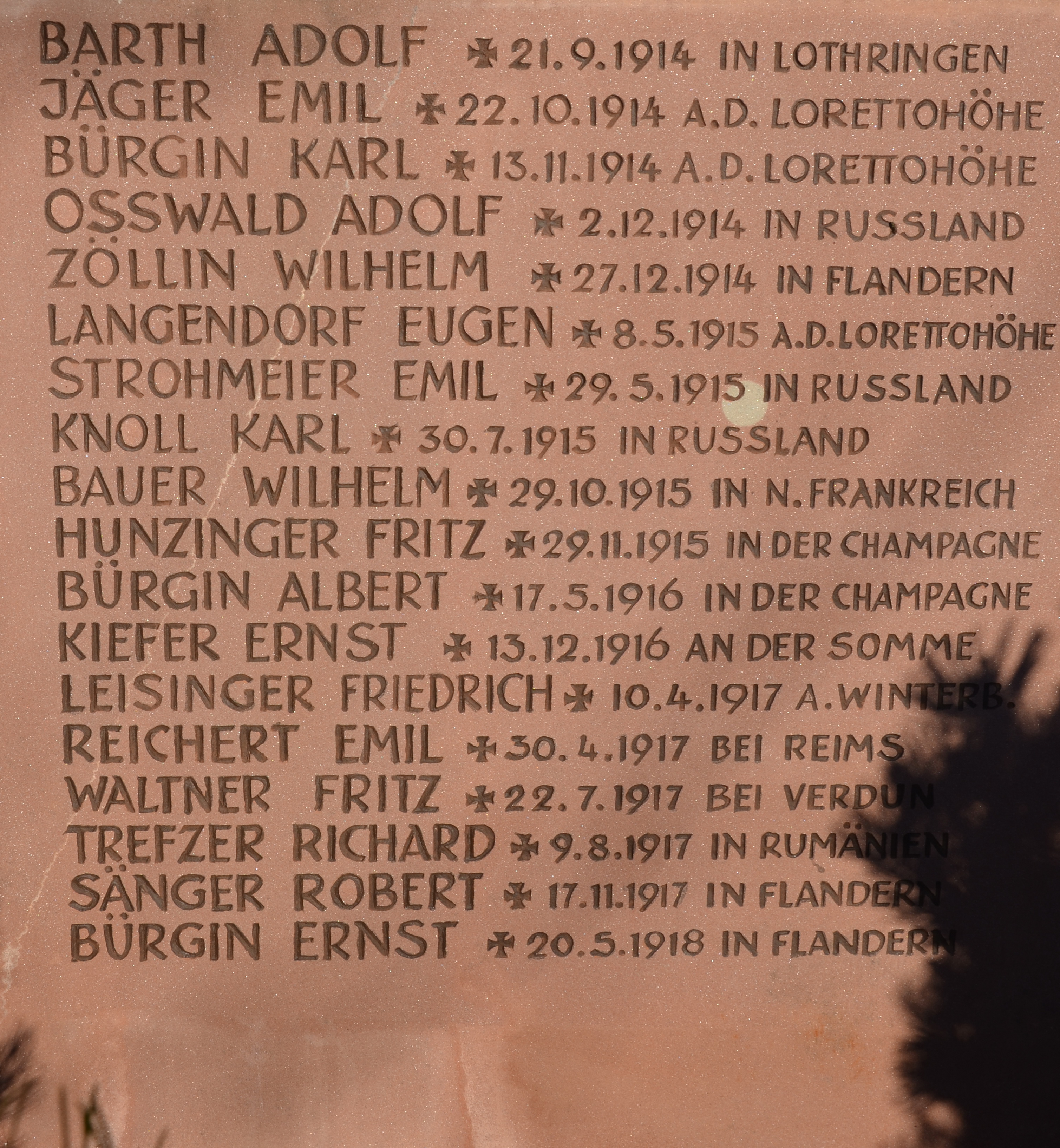 Musketier TREFZER Richard 02.04.1895 - 09.08.1917 22 Jahre alt aus Niedereggenen Gefallen in Rumänien Kriegsgräberstätte in Tifesti-Frunzoaia (RO) Name im Gedenkbuch verzeichnet |