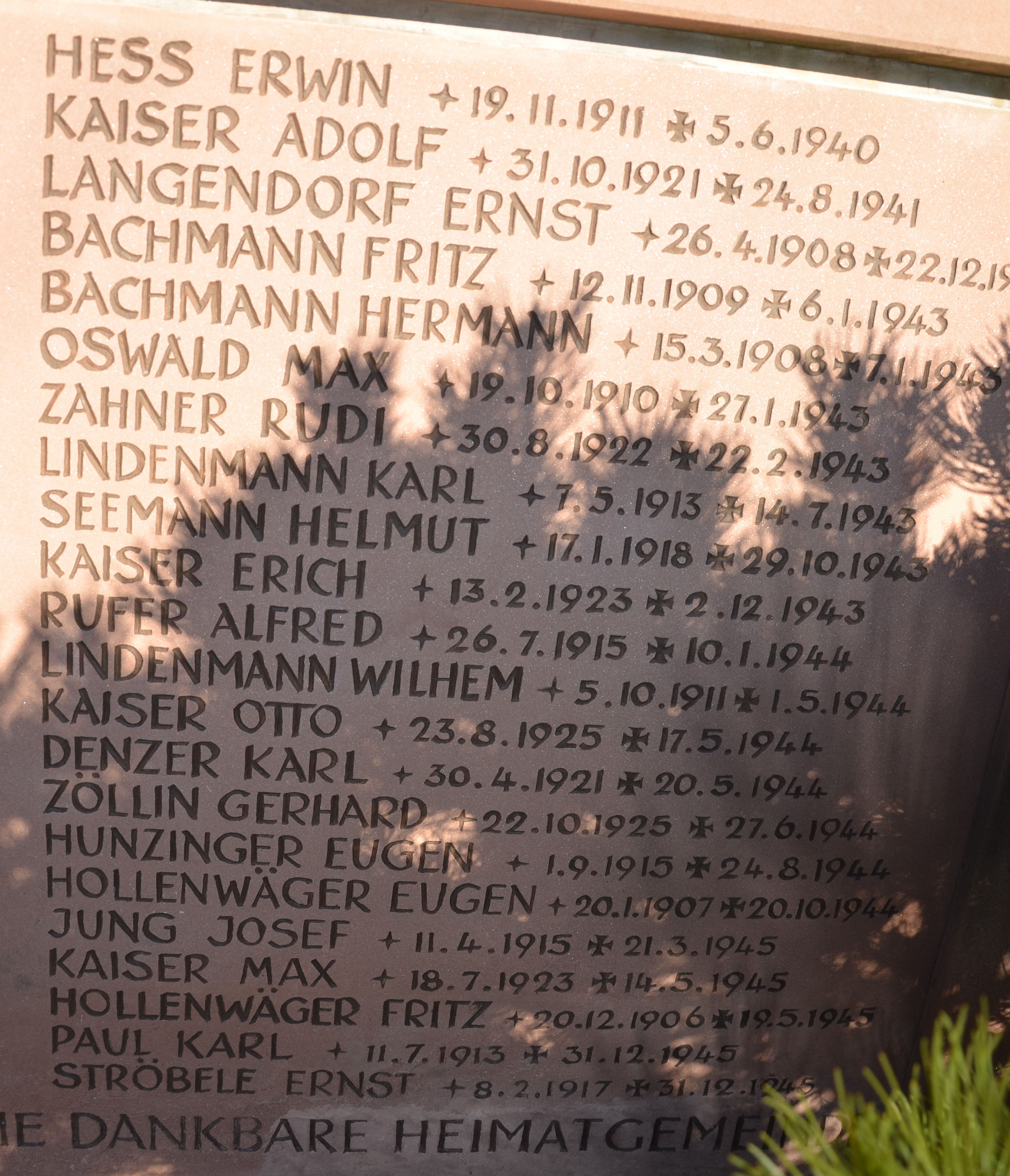 LINDEMANN Friedrich 13.10.1881 - 29.03.1945 64 Jahre alt aus Niedereggenen Ziviles Kriegsopfer. Durch Granatschuss in Schopfheim verletzt. Im Lazarett verstorben |
