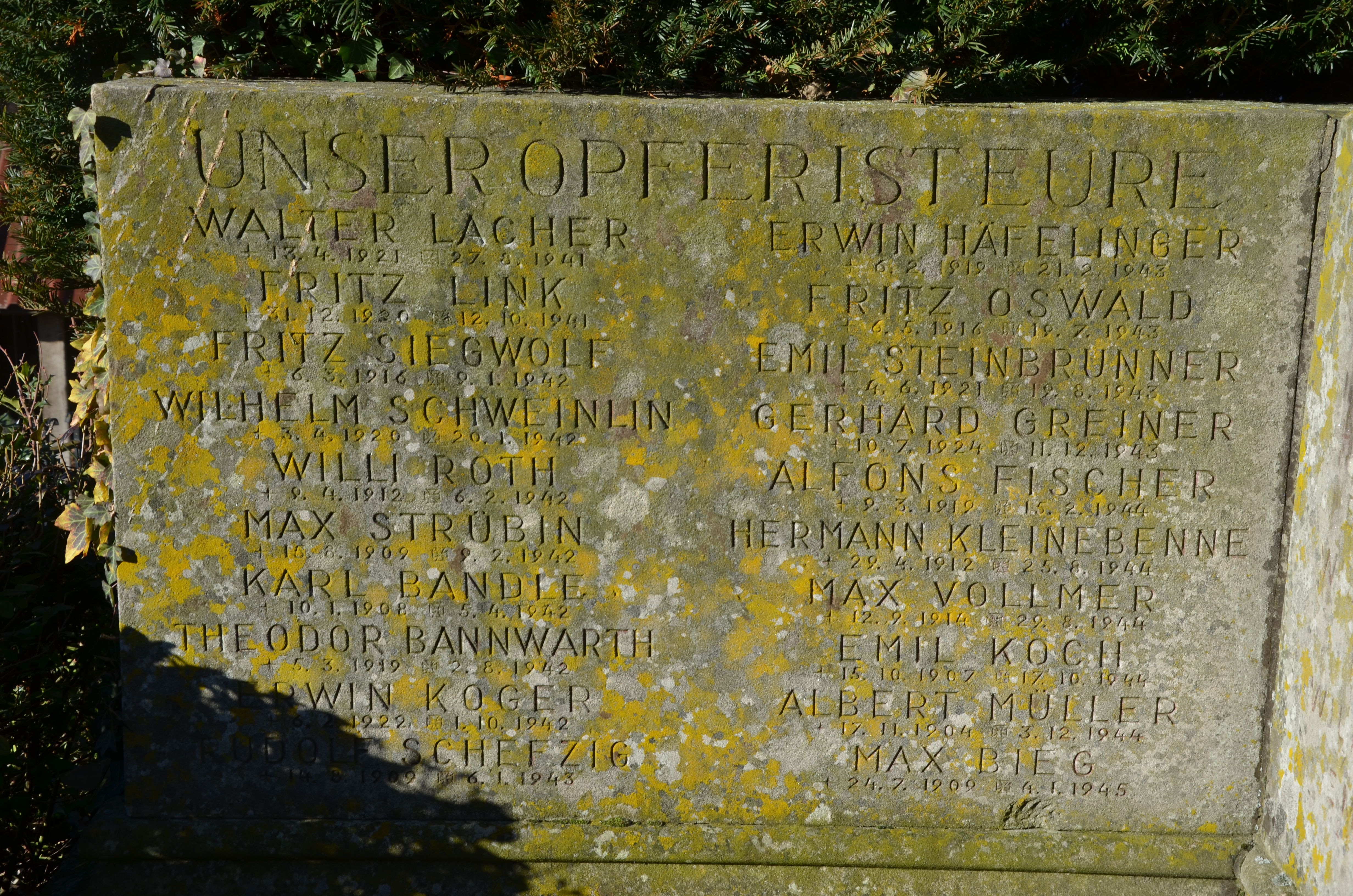 | Von den 17 Namen der Gefallenen aus dem 1. Weltkrieg (1914-1918) auf dem Kriegerdenkmal im Friedhof bei der Evangelischen Kirche in Obereggenen sind 12 Soldaten davon mit Fabian Coulot verwandt. | Von den 39 Namen der Gefallenen aus dem 2.Weltkrieg (1939-1945) auf dem Kriegerdenkmal im Friedhof bei der Evangelischen Kirche in Obereggenen sind 20 Soldaten davon mit Fabian Coulot verwandt. |