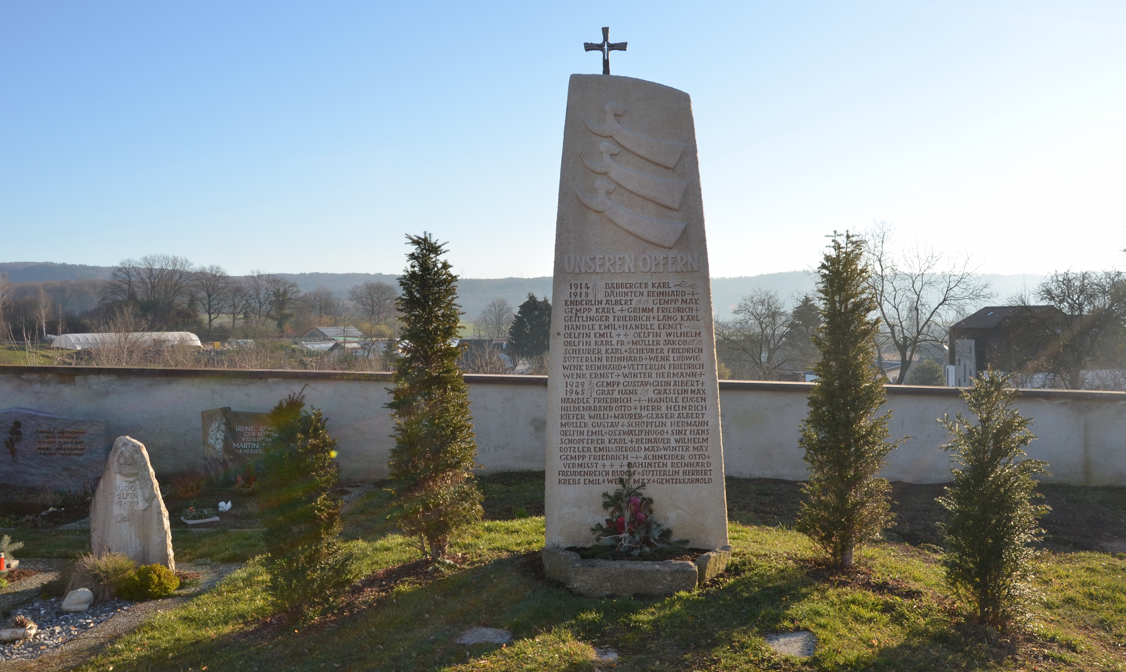| Von den 22 Namen der Gefallenen aus dem 1.Weltkrieg (1914-1918) an der Gedenkplatte einer Hauswand zwischen Kirche und Rathaus in Schallbach, sowie auf dem Kriegerdenkmal auf dem Friedhof in Schallbach, sind 21 davon mit Fabian Coulot verwandt. | Von den 28 Namen der Vermissten und Gefallenen aus dem 2.Weltkrieg (1939-1945) auf dem Denkmal im Firdhof von Schallbach sind 23 davon mit Fabian Coulot verwandt. |