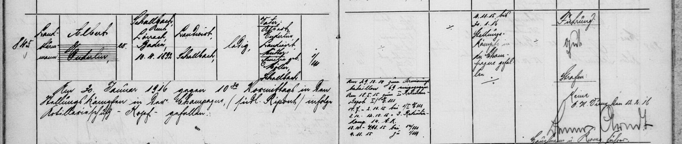 ENDERLIN Albert 10.04.1892 - 30.01.1916 24 Jahre alt aus Schallbach 3. Badische Infanterie-Regiment Markgraf Ludwig Wilhelm No.111 1. Kompagnie Gefallen durch Artilleriebeschuss bei Stellungskämpfen in Ripont in der Champagne (FR) |