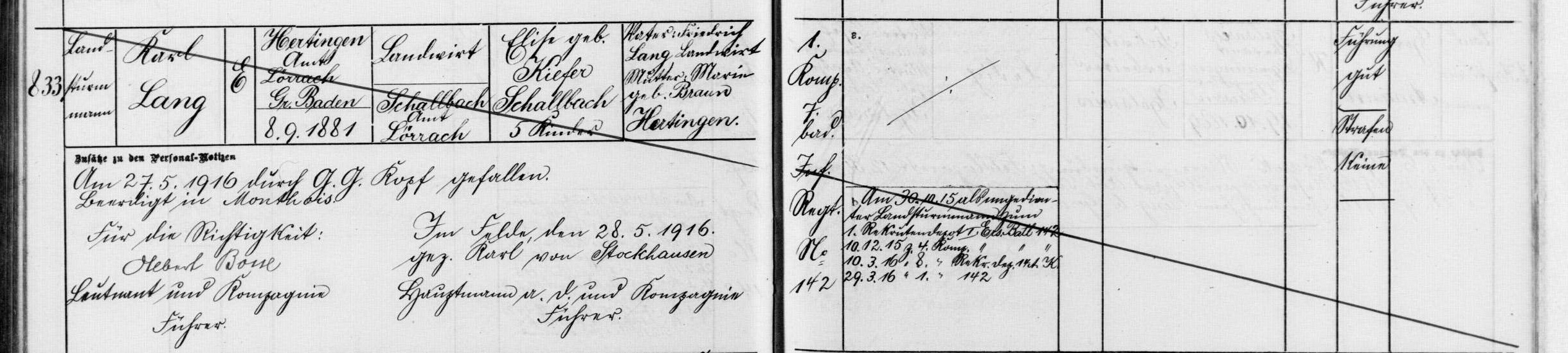 LANG Karl 08.09.1881 - 27.05.1916 35 Jahre alt aus Schallbach 7. Badische Infanterie-Regiment No.142 1. Kompagnie Gefallen in Ripont (FR) Kriegsgräberstätte Monthois (FR) Block 1, Grab 119 |