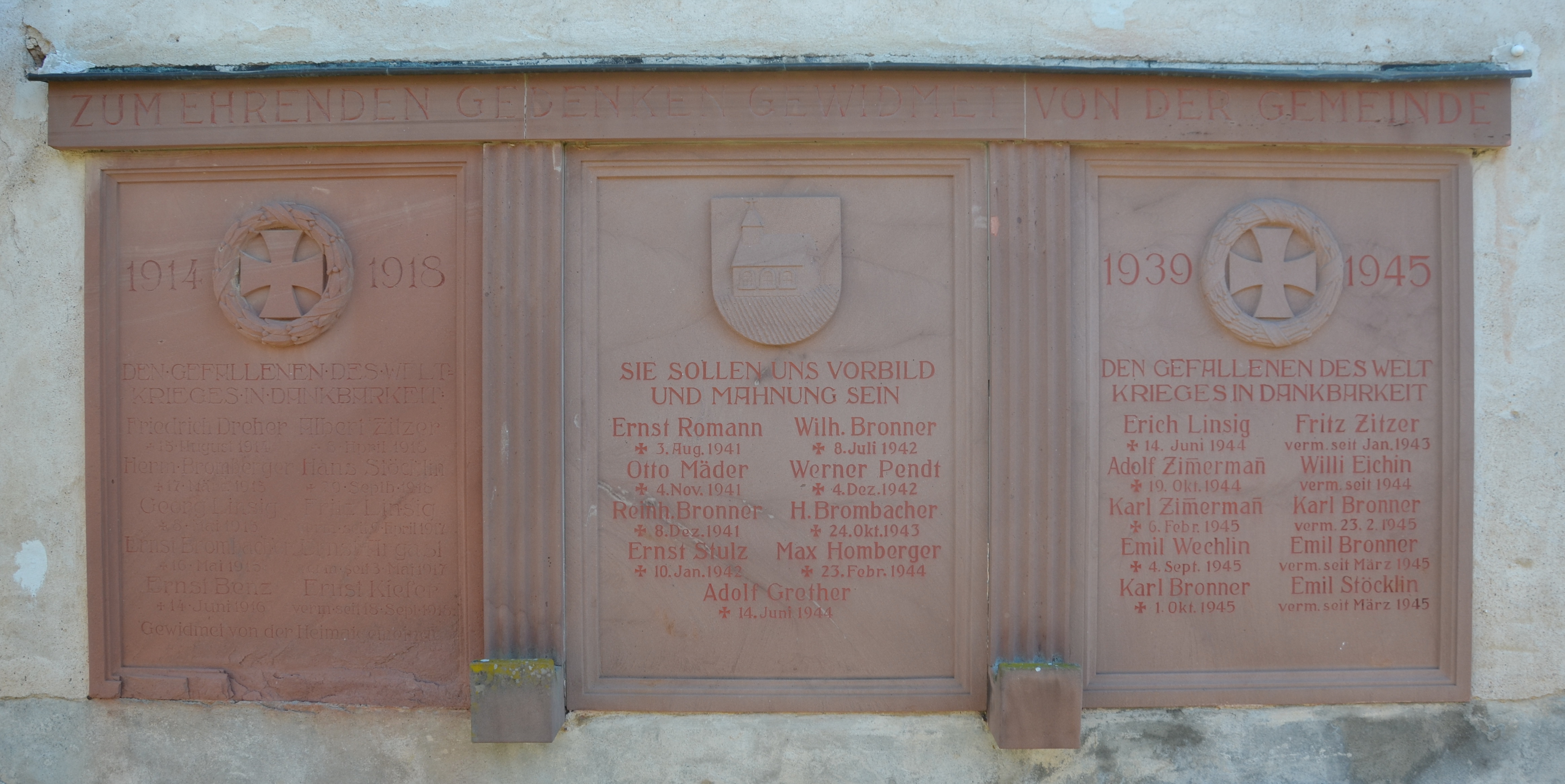 | Von den 10 Namen der Gefallenen aus dem 1.Weltkrieg (1914-1918) auf der Gedenkplatte an der Kirche von Sitzenkirch sind 9 davon mit Fabian Coulot verwandt. | Von den 19 Namen der Gefallenen aus dem 2. Weltkrieg (1939-1945) auf der Gedenkplatte an der Kirche von Sitzenkirch sind 16 davon, plus 1 welcher offenbar vergessen wurde, mit Fabian Coulot verwandt. |