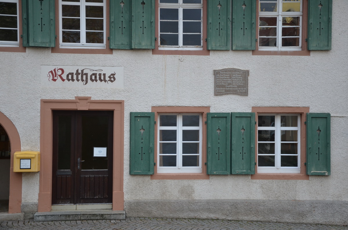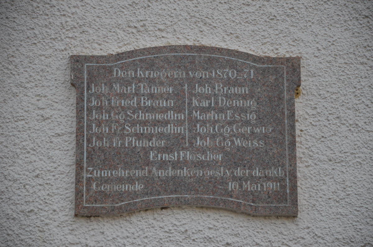 und den Weinreben am Waldrand. Die Gedenktafel aus dem Deutsch-Französischen Krieg 1870/71 am Rathaus neben der Evangelischen Kirche. |