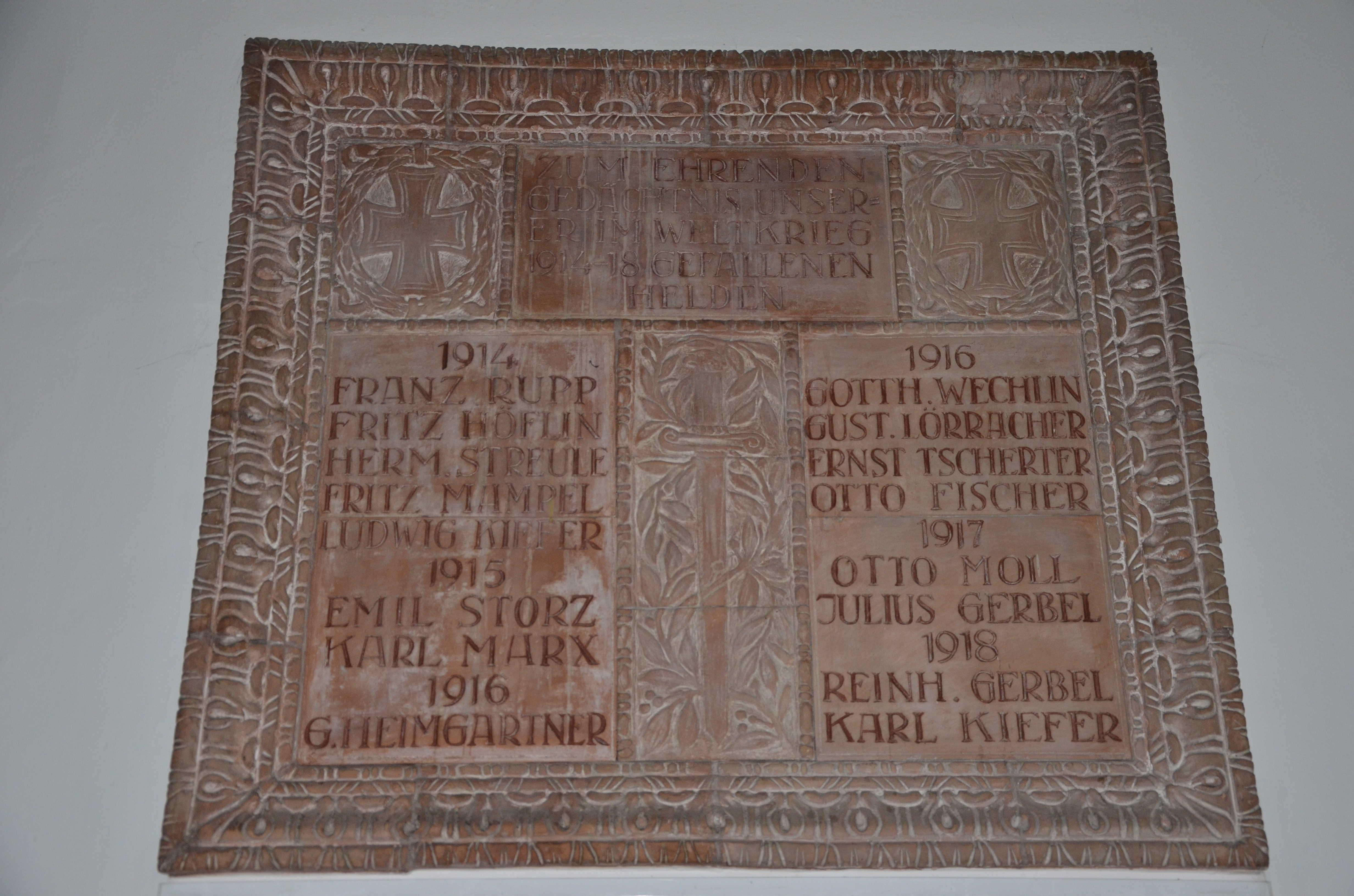 Je eine Gedenkplatte im Innern der Kirche und an der Aussenwand erinnert an die Gefallenen der beiden Weltkriege.