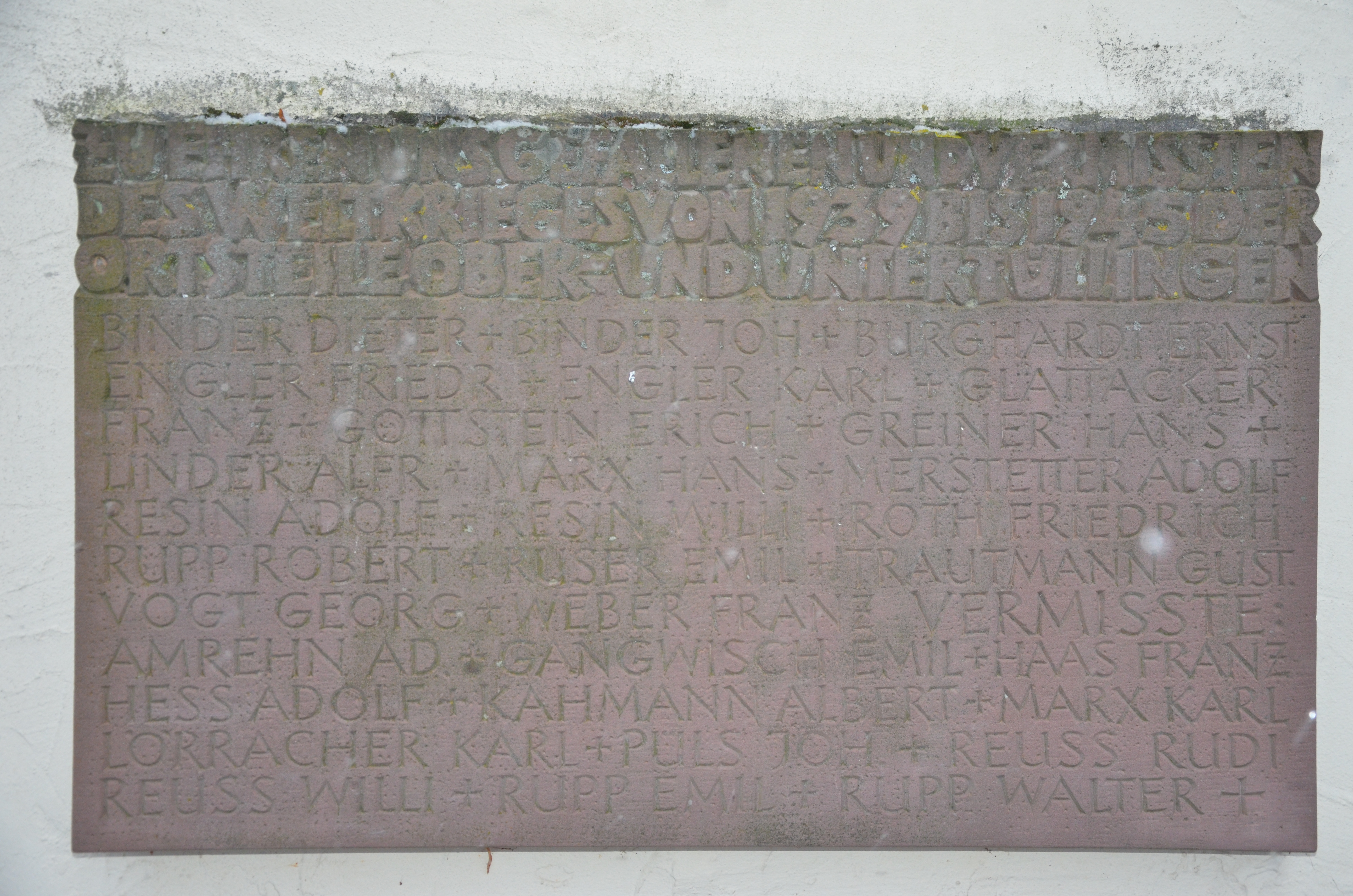 | Von den 16 Namen der Gefallenen aus dem 1. Weltkrieg (1914-1918) auf der Gedenkplatte im Innern der St. Ottilienkirche sind 10 mit Fabian Coulot verwandt | Die Gefallenen aus dem 2. Weltkrieg (1939-1945) konnten im Stammbaum von Fabian Coulot nocht nicht übernommen werden, da dass Ortsfamilienbuch Tüllingen nur bis ins Jahr 1905 erfasst wurde. |