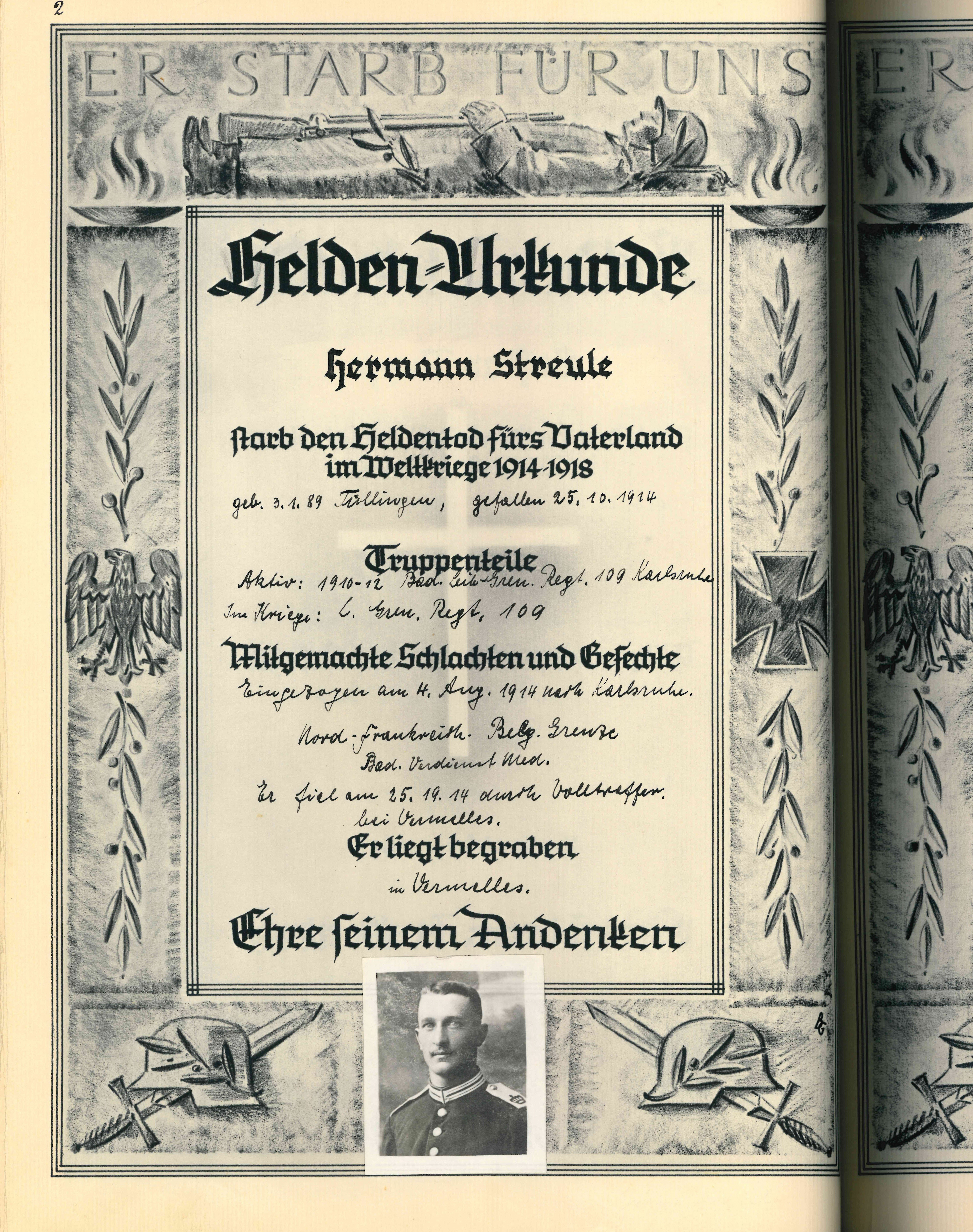Grenadier Karl Gustav HEIMGARTNER 23.04.1882 - 01.07.1916 34 Jahre alt aus Tüllingen Reserve-Infanterie-Regiment No.109 1. Kompagnie Gefallen in Frankreich |