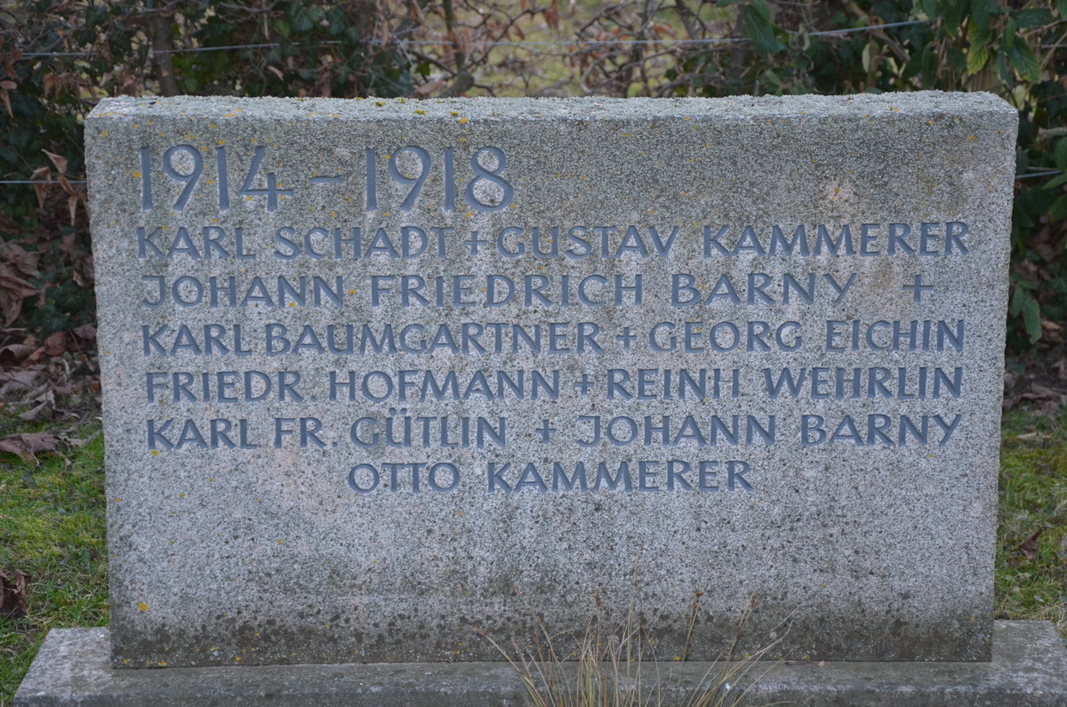 | Soldat GÜTLIN Karl Friedrich 13.09.1872 - 27.09.1918 46 Jahre alt aus Wintersweiler "Obwohl sein Name auf dem Gedenkstein der Gefallenen des 1.Weltkriegs vermerkt ist, wurde durch mündliche Überlieferung seiner Angehörigen mitgeteilt, das er nie im Krieg war. Ist wahrscheinlich an der damals grassierenden Spanischen Grippe gestorben |