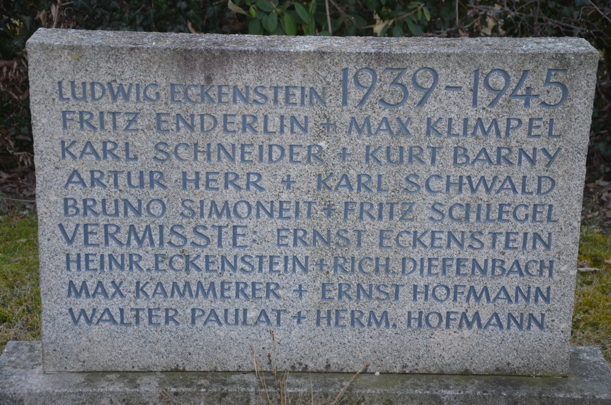 | Soldat ECKENSTEIN Heinrich 27.07.1921 - 01.01.1943 22 Jahre alt aus Wintersweiler Gilt als vermisst in Stalingrad (RUS) Kriegsgräberstätte Rossoschka (RUS) Würfel 14, Platte 19 |