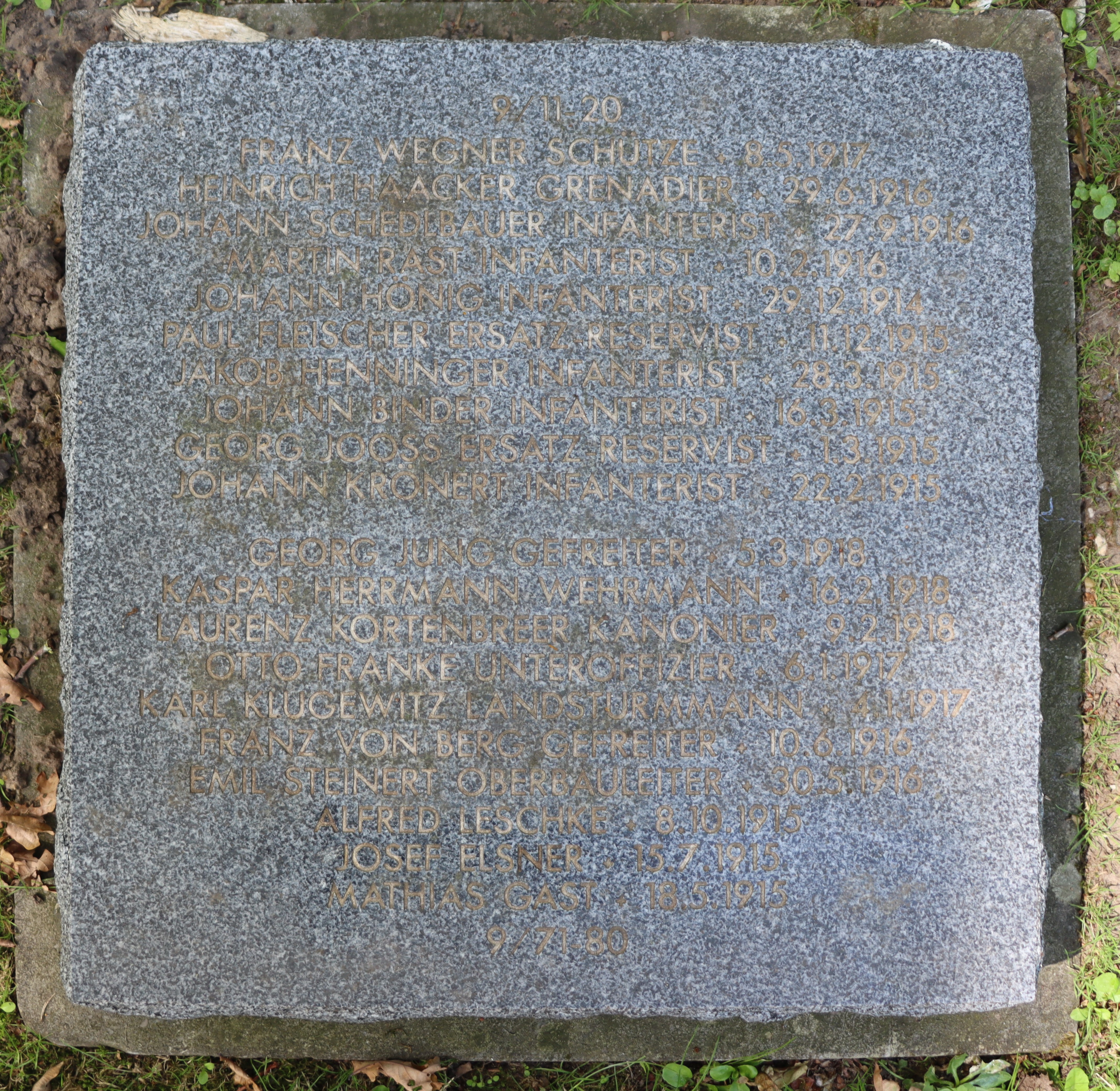 Musketier Johannes STEIN 26.07.1894 - 25.09.1915 21 Jahre alt aus Wittlingen 5. Badische Infanterie-Regiment No.113 7. Kompagnie Gefallen in St.Marie-en-Picardie Kriegsgräberstätte Souain (FR) Unter den unbekannten Soldaten |