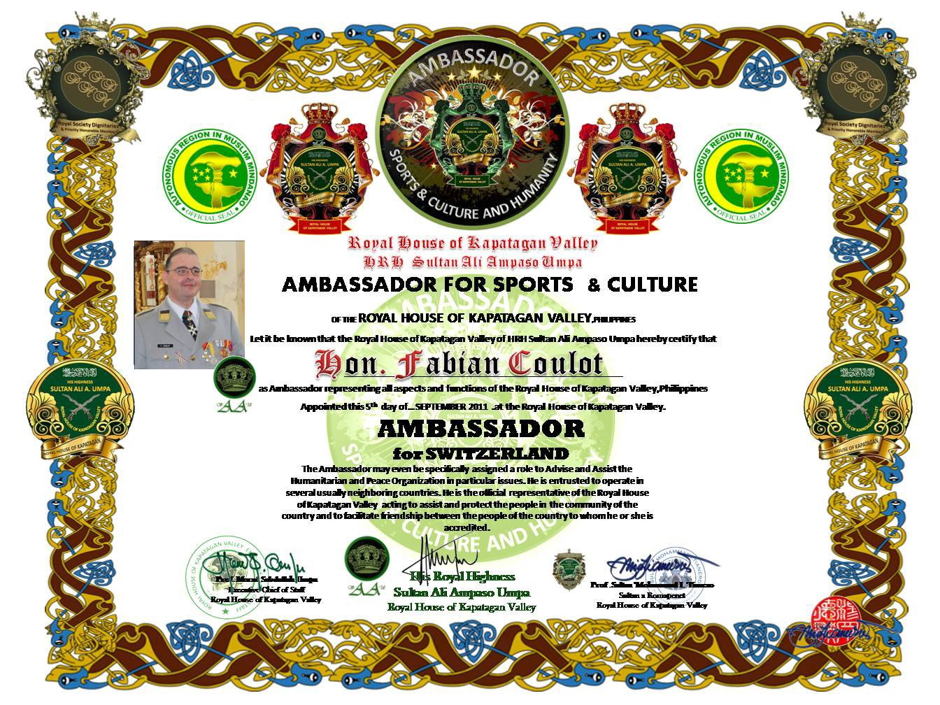 Am 5. September 2011 erfolgte die Ernennung zum "Ambassador for Sports & Culture and Humanity" als AMBASSADOR for SWITZERLAND