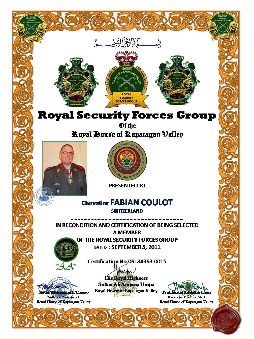 ebenso die Ernennung zum Mitglied der ROYAL SECURITY FORCES GROUP des königlichen Haushaltes von Kapatagan Valley
