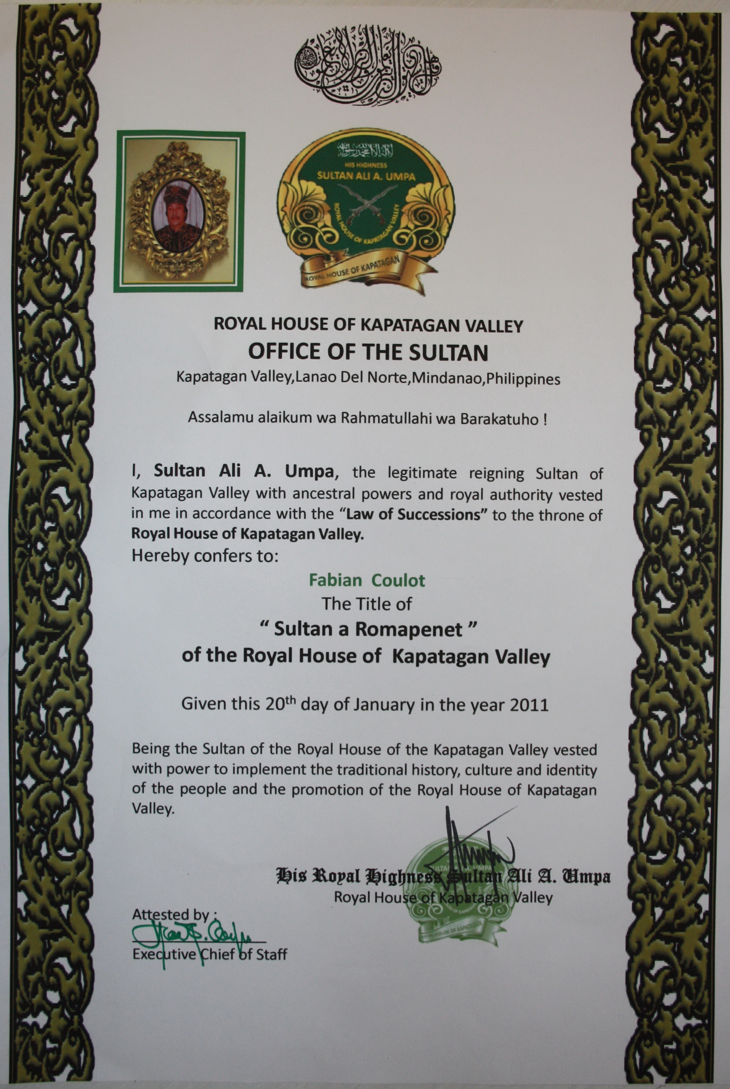 Die Ernennung erfolgte durch Seine Königliche Hoheit Sultan Ali Ampaso Umpa von Kapatagan Tal in Lanao Del Norte, Mindanao, Philippinen