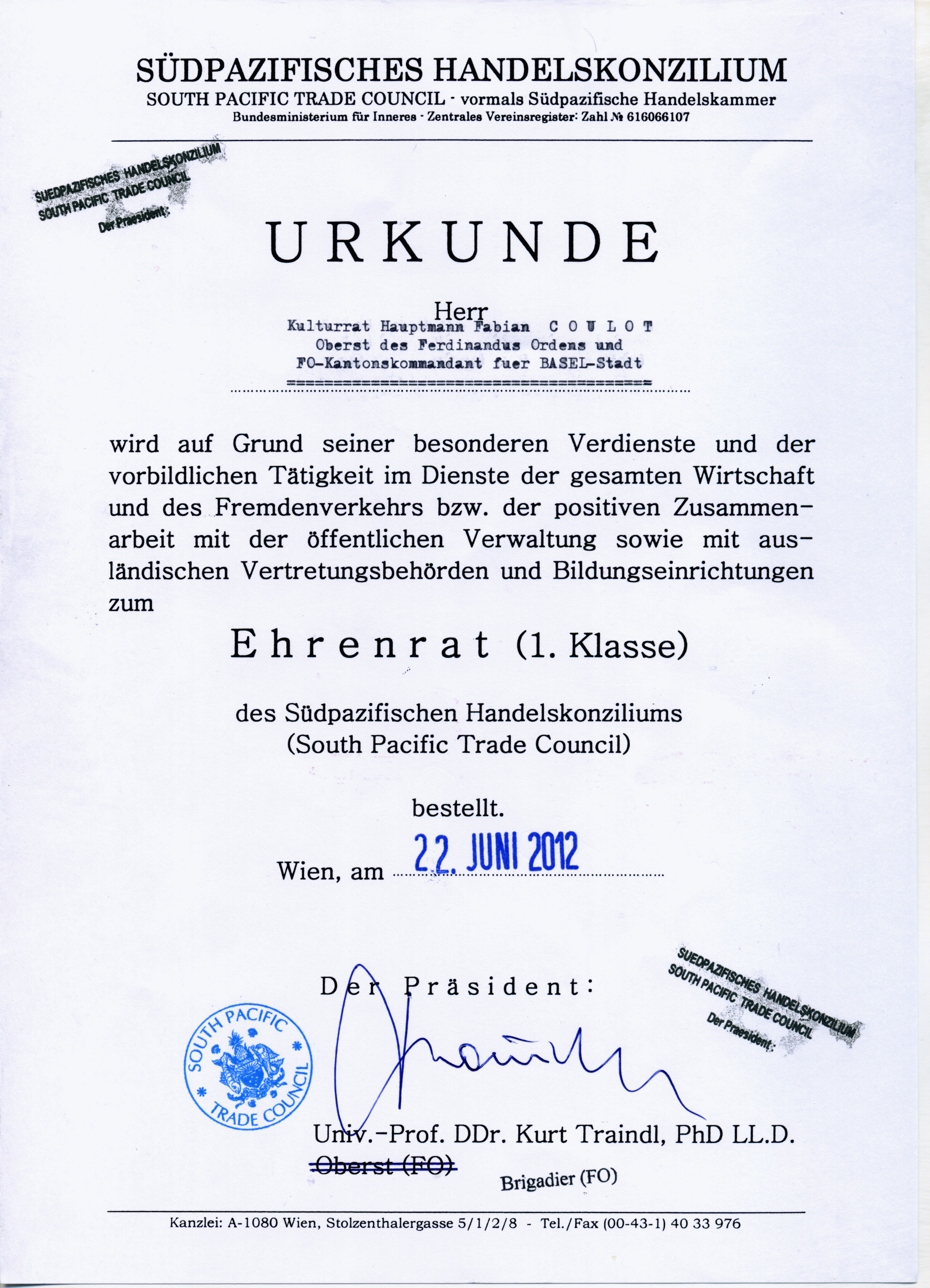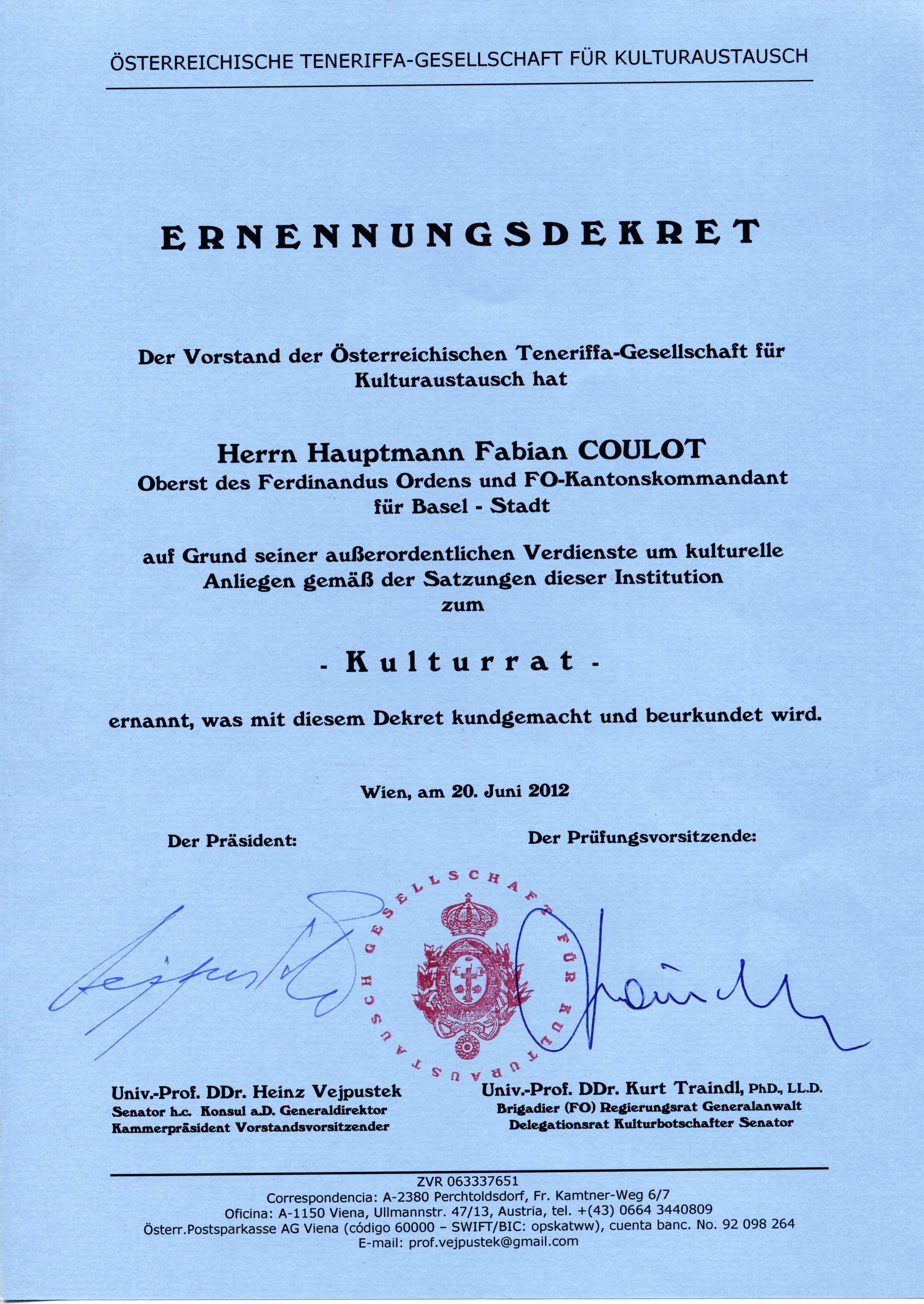 Im Anschluss der Investitur und Hochfestes des Ferdinandus Orden 1561 vom Samstag, 7. Juli 2012 im Garten des Klagenfurtes Domes, wurde ich per Dekret vom 20. Juni 2012 von der Österreichischen Teneriffa-Gesellschaft für Kulturaustausch durch Kulturdirektor Alfred Deimbacher und Regierungsrat Franz Satzinger vom Österreichischen Kameradschaftsbund, Stadtverband Hollabrun zum "Kulturrat" ernannt, ebenso per Dekret vom 22. Juni 2012 zum "Ehrenrat (1.Klasse)"
